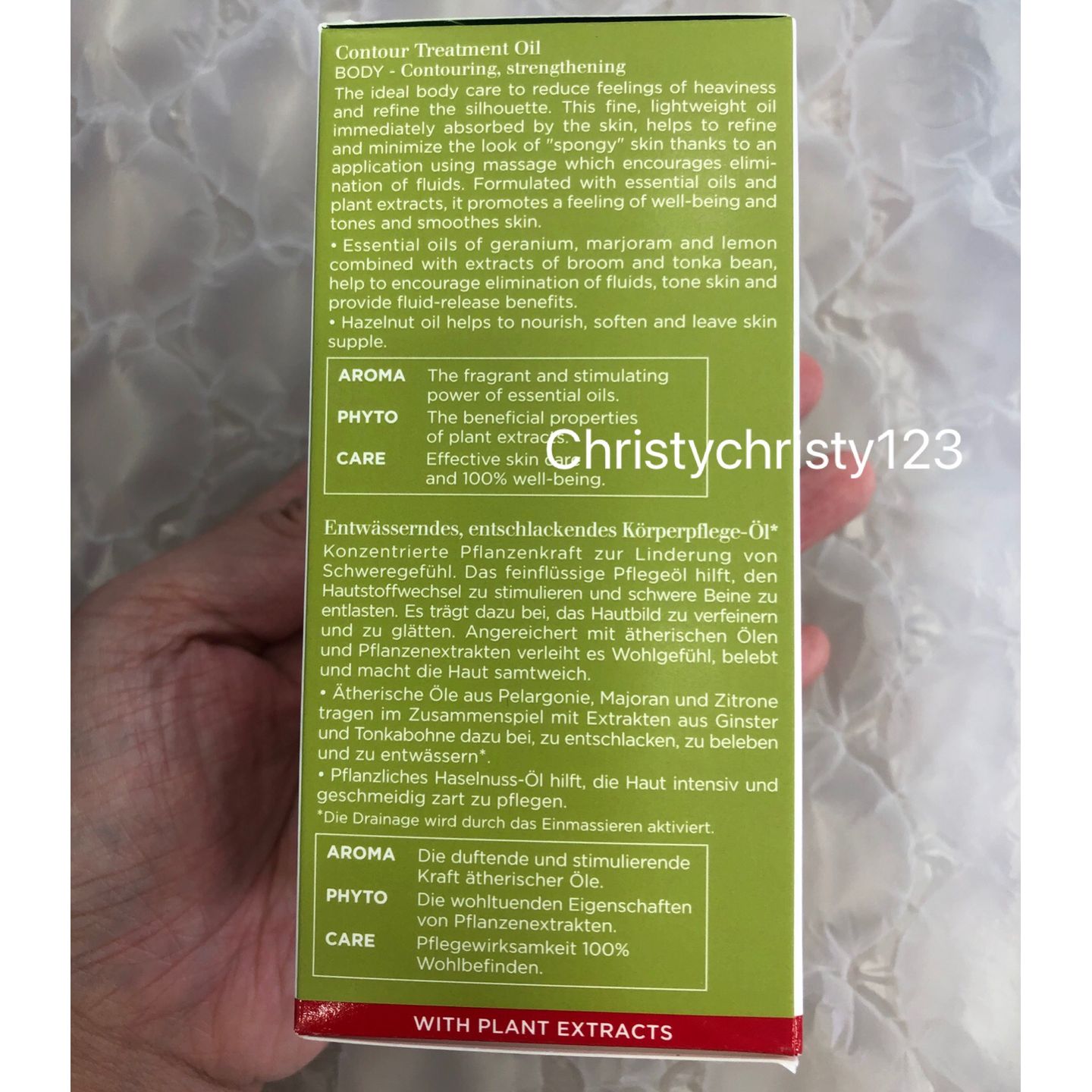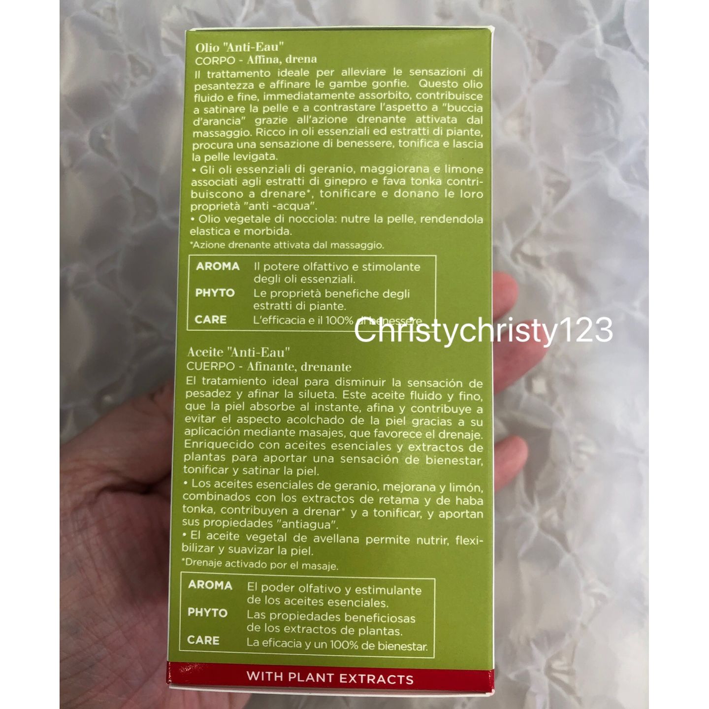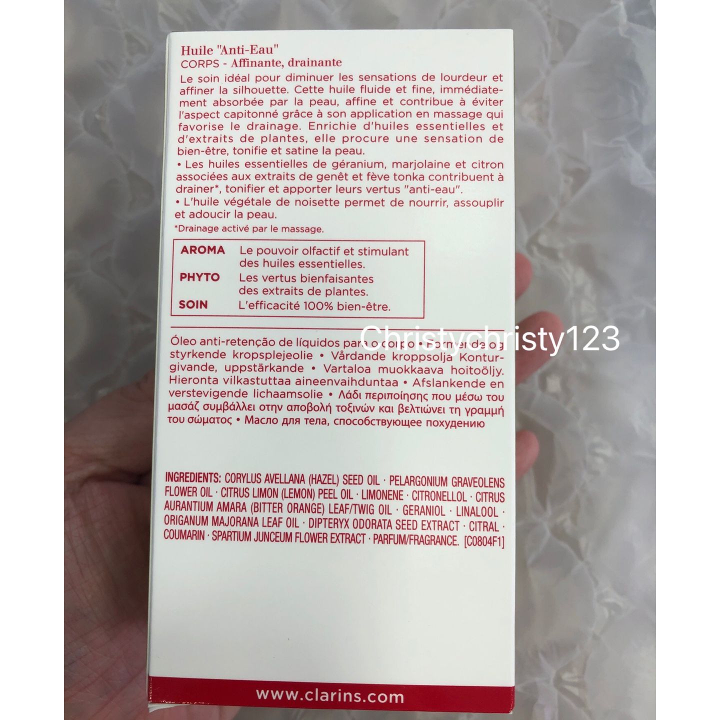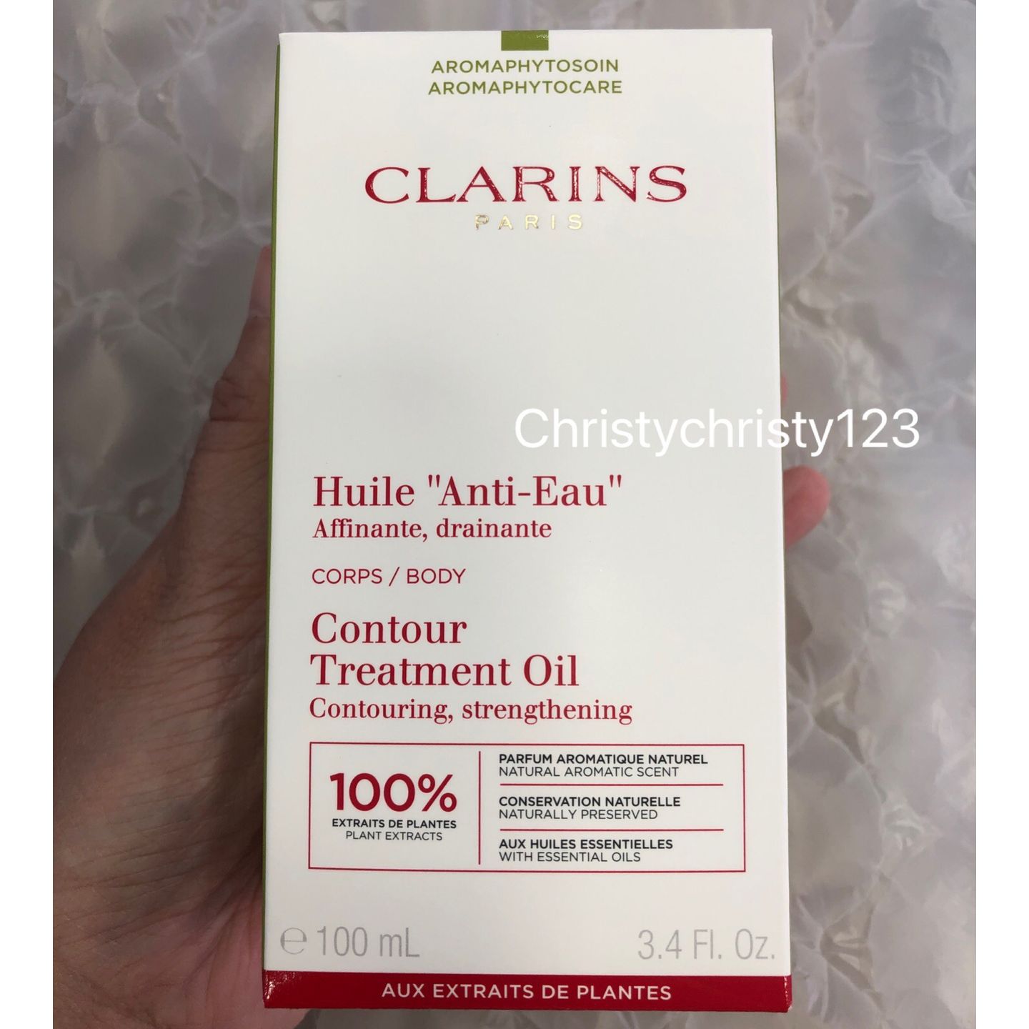 有效日期 : 2024年 02月 產地 : 法國 (Made in France) 品名 : Clarins 排水身體護理油 (Clarins Huile "Anti-Eau" Contour Body Treatment Oil) 容量 : 100 ml 產品描述 : ** 護理油以100%純植物萃取研製,配方融合了金雀花、天竺葵和薄荷精油,幫助排走毒素,讓肌膚更緊緻有彈性,預防橙皮紋的出現 ** 榛果油極為滋潤,讓肌膚如絲緞般柔軟。香氣帶來身心靈的愉悅享受。不留污跡 ** 有效幫助排走毒素, 讓肌膚更緊緻有彈性 ** 預防肌膚缺水, 香氣細膩,更帶來身心靈的愉悅享受 使用方法 : ** 可在濕潤或擦乾的肌膚上使用。取出小量護理油,輕柔地從腳踝向上塗至腰部 ** 使用後在冷水中清洗 🌟訂購產品前,歡迎 WhatsApp 6053 7862 或致電客服 2446 0981 查詢貨存,謝謝🙏 🌟