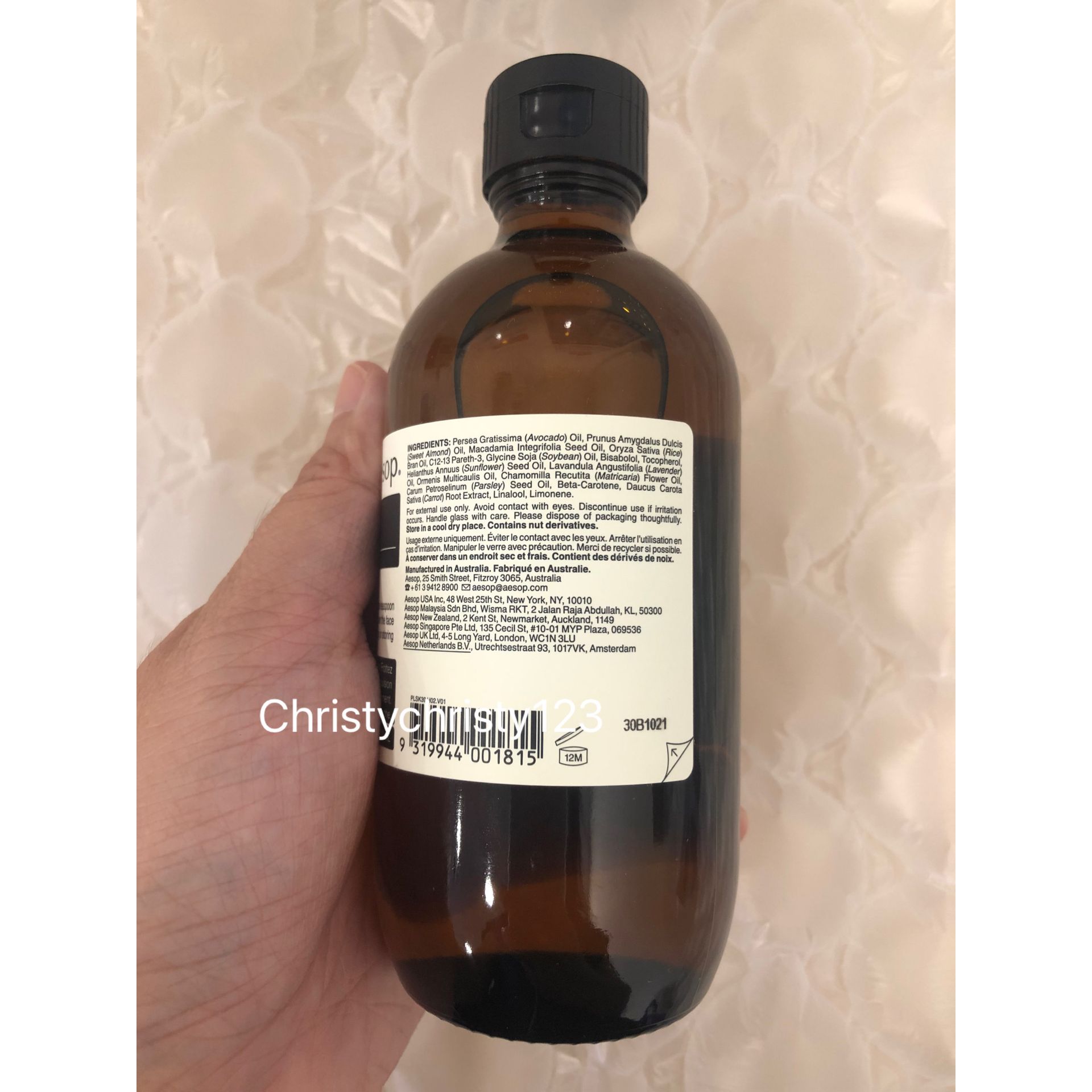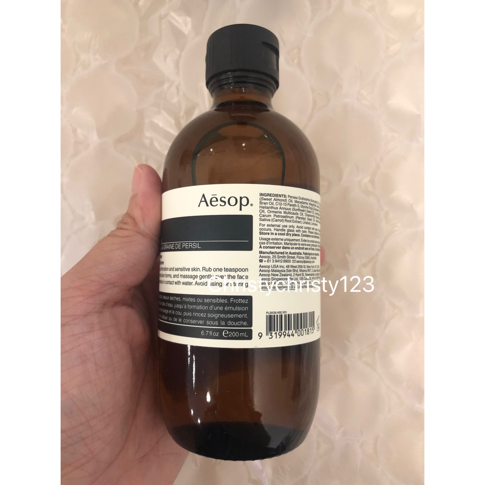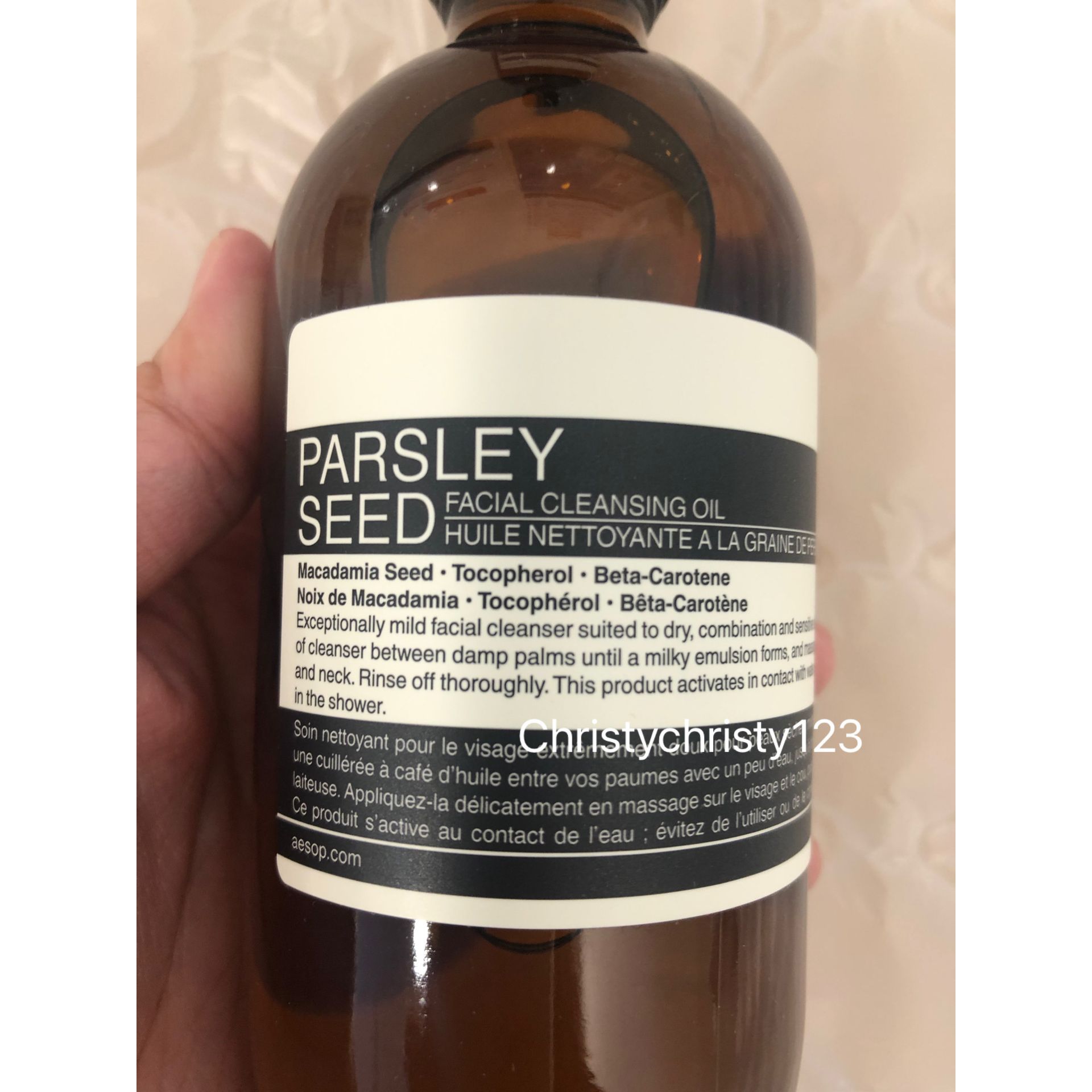 有效日期 : 2025年 10月 產地 : 澳洲 (Made in Australia) 品名 : Aesop Parsley Seed Facial Cleansing Oil 香芹籽潔面油 容量 : 200 ml 產品描述 : ** 卸妝油蘊含豐富的脂肪酸及可鎮靜皮膚的物質,能徹底潔淨並滋潤肌膚 ** 適用於中性、混合性、乾燥及敏感性皮膚, 秋季及清涼季節 ** 水溶性潔面油, 主要成分: 夏威夷果仁油, 生育酚, β-胡蘿蔔素 ** 膚質感受到鎮靜柔潤,溫和潔膚 ** 含有草本芳香、花朵芬香、堅果氣味 使用方法 : ** 早晚使用 **混合一茶匙分量於三至五滴清水中 ** 於掌心把混合物調成乳狀,並按摩濕潤的臉部及頸部,然後徹底洗淨 🌟訂購產品前,歡迎 WhatsApp 6053 7862 或致電客服 2446 0981 查詢貨存,謝謝🙏 🌟