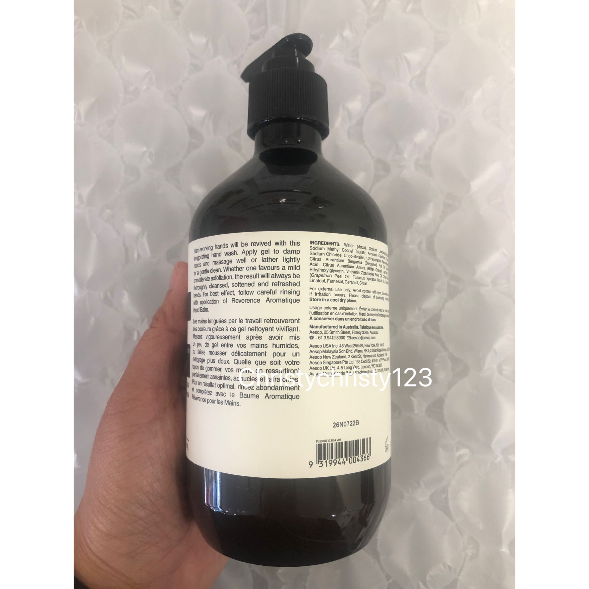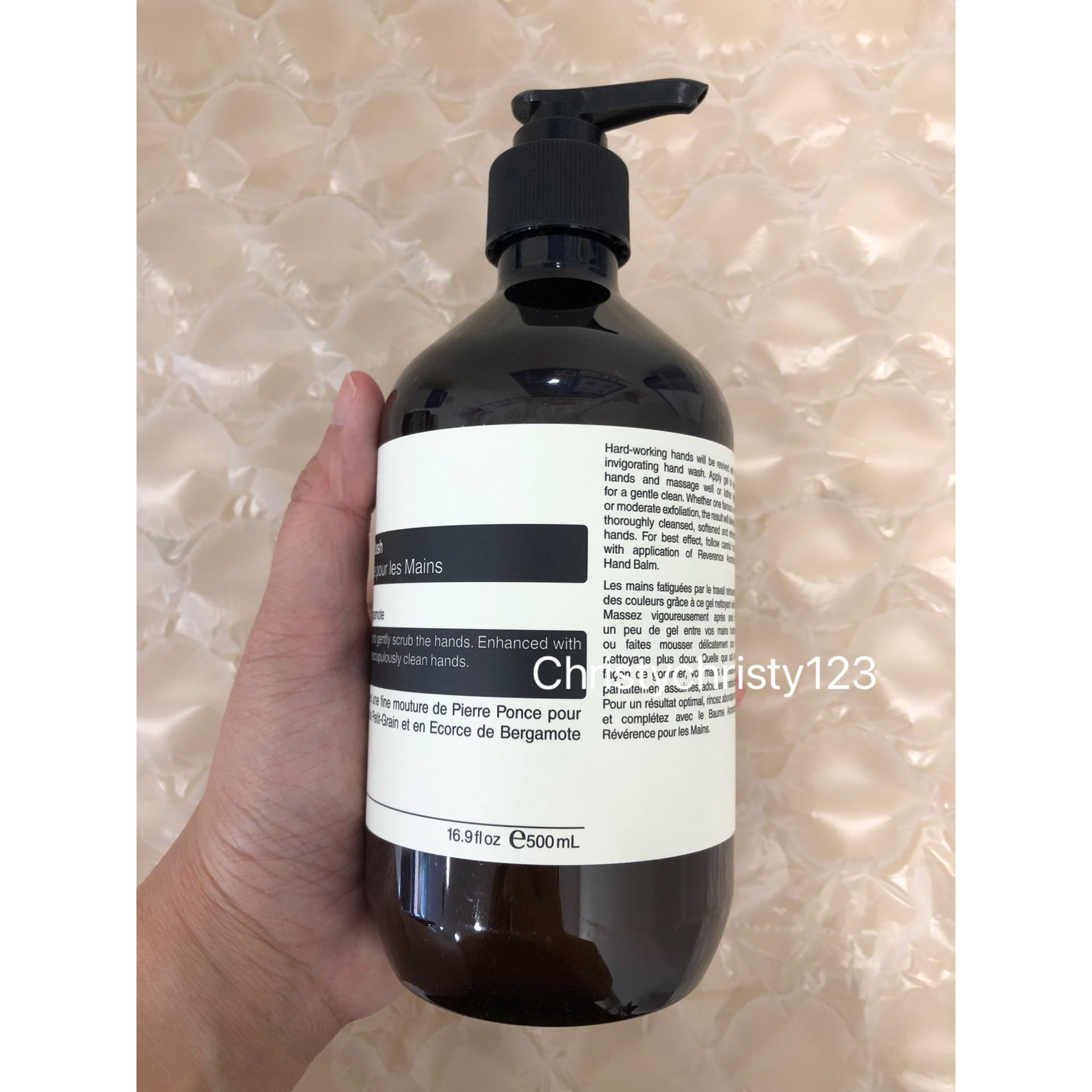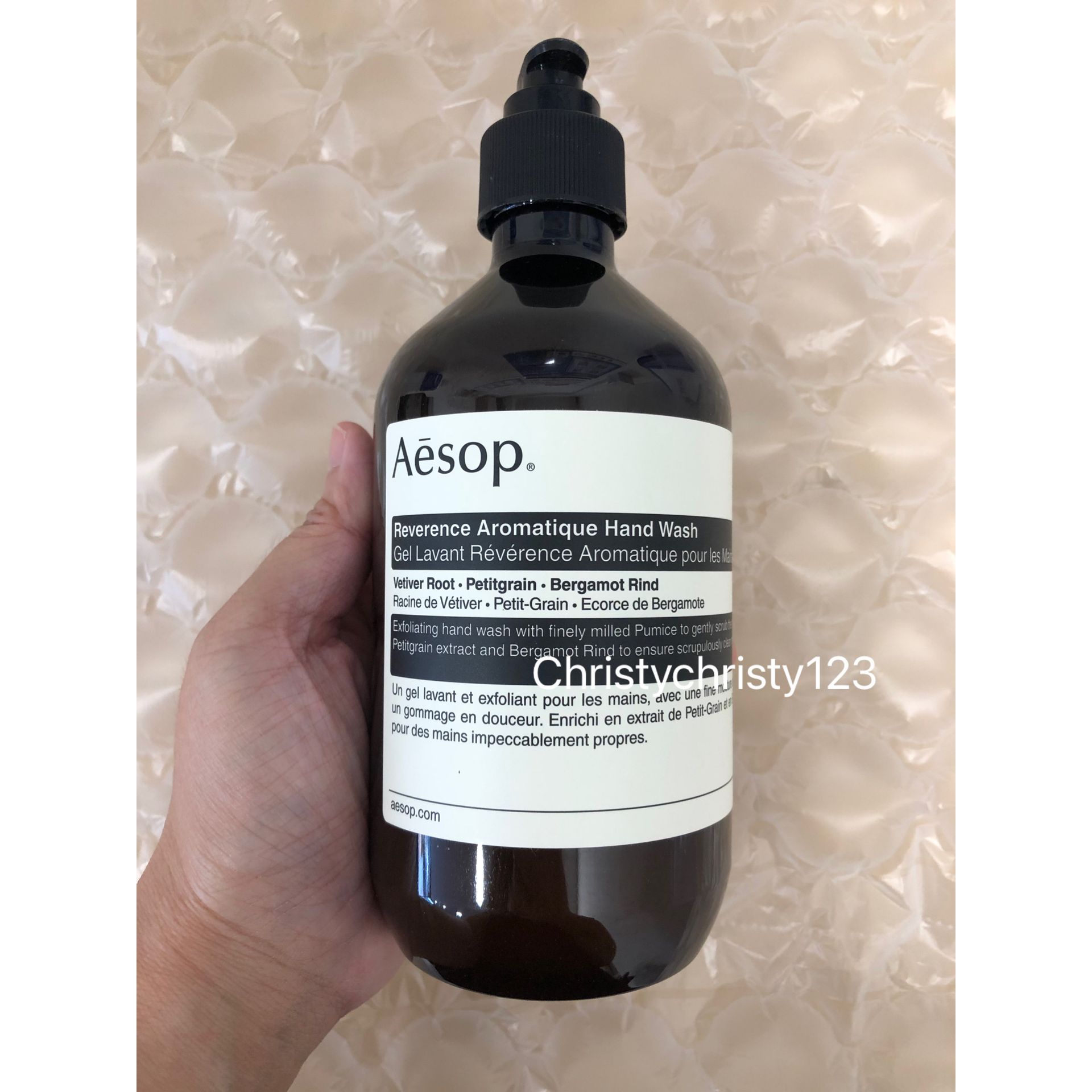 有效日期 : 2026年 05月 產地 : 澳洲 (Made in Australia) 品名 : Aesop 尊尚芳香手部清潔露 (洗手液) Aesop Reverence Aromatique Hand Wash 容量 : 500 ml 產品描述 : ** 幽香獨特的配方蘊含草本植物萃取物及經精細研磨的浮石,有效潔膚和去角質,潔淨雙手之餘帶來柔滑清爽的感覺 ** 質地是帶微粒的透明凝露 ** 膚質感受到徹底潔淨,滋潤柔滑, 含有樹木清香、土壤氣息、煙燻風味 ** 主要成分: 岩蘭草根, 苦橙葉, 佛手柑 使用方法 : ** 一次壓按, 把適量倒於濕潤的雙手並搓至起泡,然後徹底洗淨 🌟訂購產品前,歡迎 WhatsApp 6053 7862 或致電客服 2446 0981 查詢貨存,謝謝🙏 🌟
