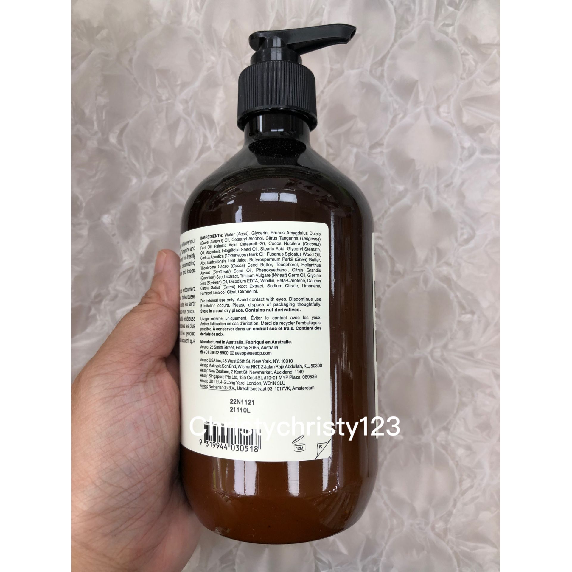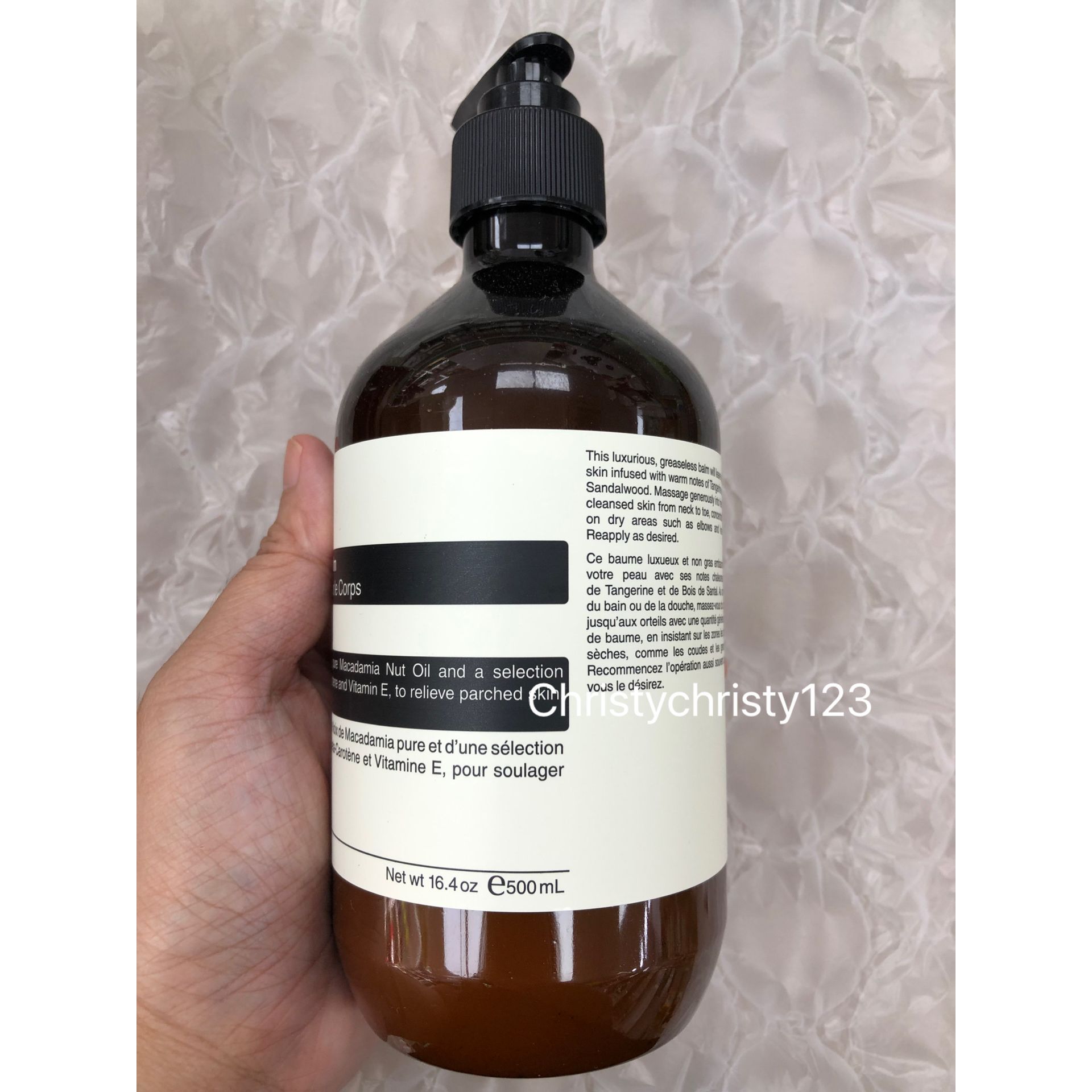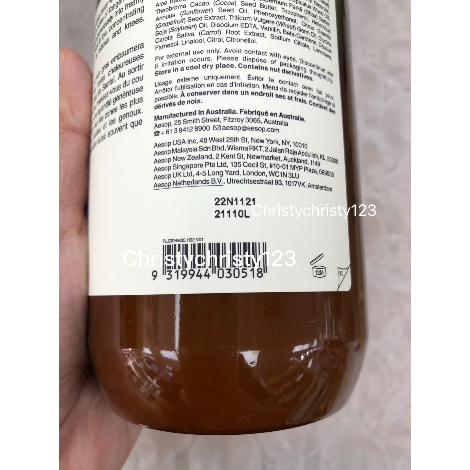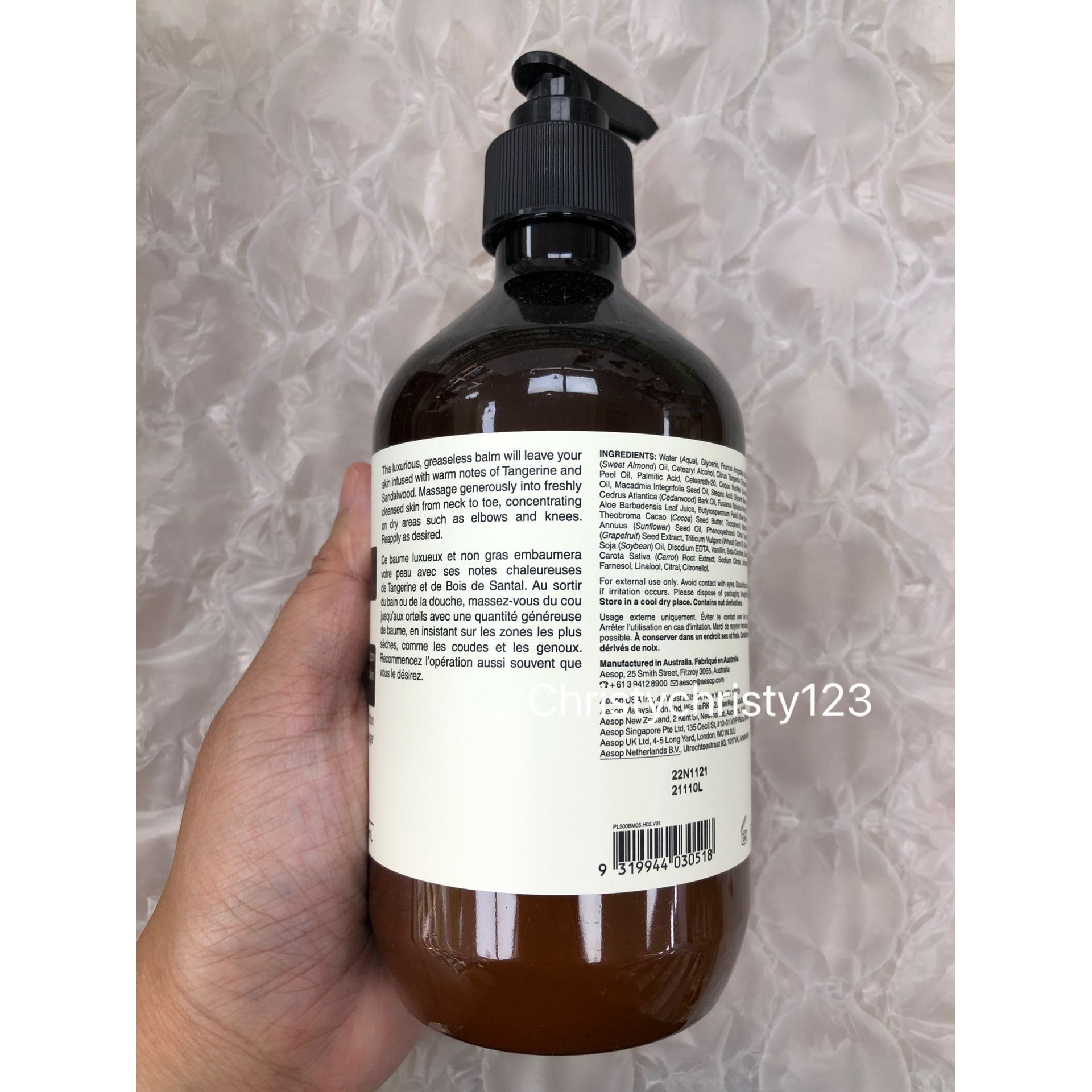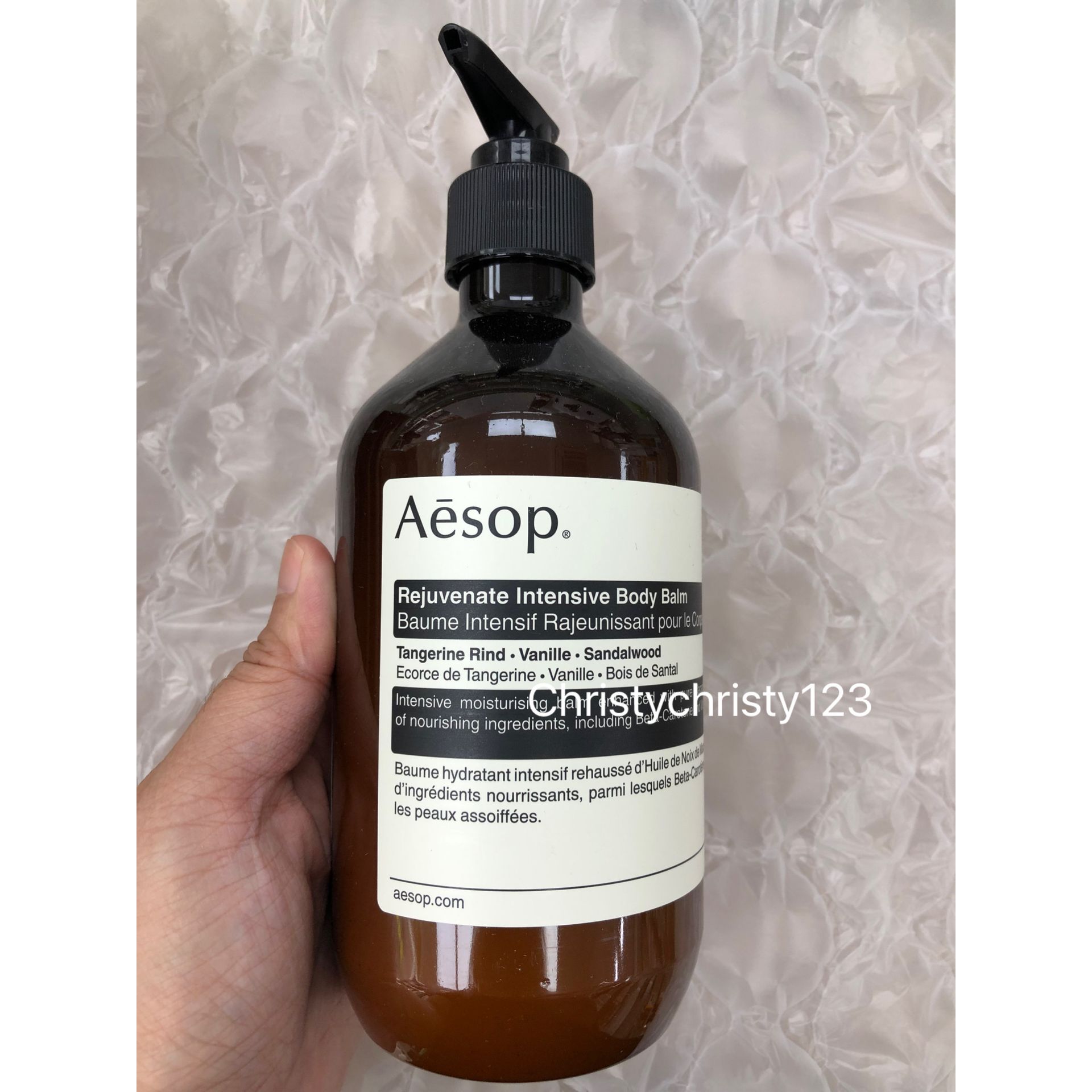 有效日期 : 2024 年 11月 產地 : 澳洲 (Made in Australia) 品名 : Aesop 滋潤芳香身體乳霜 (Aesop Rejuvenate Intensive Body Balm) 容量 : 500 ml 產品描述 : ** 奢華潤濕乳霜蘊含保濕的澳洲胡桃及檀香精油,有效修護乾燥皮膚 ** 含有柑橘皮、香草、檀香, 深度保濕滋潤 ** 質地是輕豐潤乳霜, 蘊含柑橘、香草、樹木清香 使用方法 : ** 早上及晚上潔膚後,從頸部至腳指柔軟按摩,可集中於乾燥部位使用,例如手肘、膝蓋和雙腳 🌟訂購產品前,歡迎 WhatsApp 6053 7862 或致電客服 2446 0981 查詢貨存,謝謝🙏 🌟