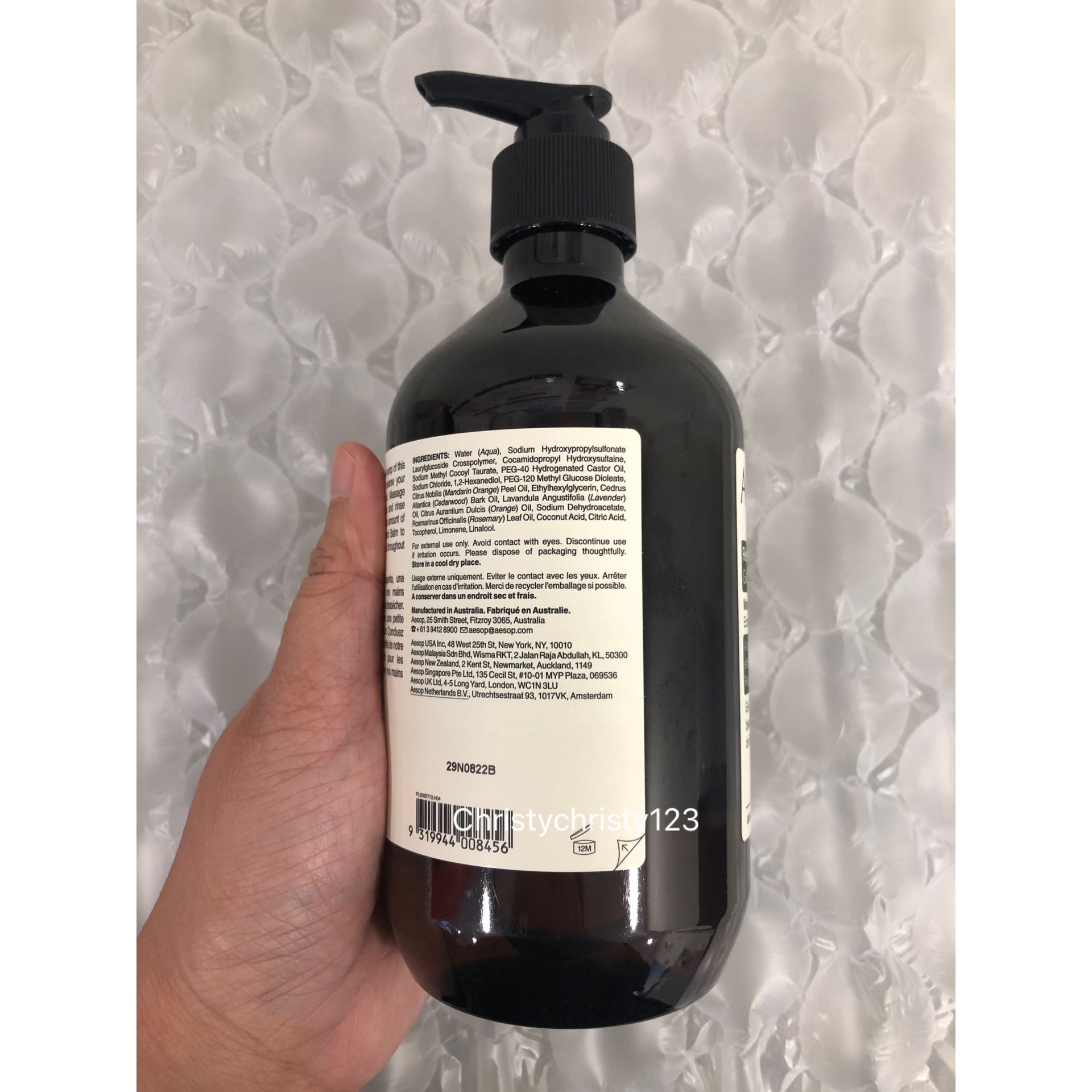 有效日期 : 2026 年 08月 產地 : 澳洲 (Made in Australia) 品名 : Aesop 賦活芳香手部清潔露 (Aesop Resurrection Aromatique Hand Wash) 容量 : 500 ml 產品描述 : ** 幽香獨特的配方蘊含草本植物萃取物及經精細研磨的浮石,有效潔膚和去角質,潔淨雙手之餘帶來柔滑清爽的感覺 ** 透明揮發凝膠質地, 膚質感受到徹底潔淨,滋潤柔滑 ** 含有樹木清香、土壤氣息、煙燻風味 ** 主要成分: 岩蘭草根 、 苦橙葉 、 佛手柑 使用方法 : ** 把適量倒於濕潤的雙手並搓至起泡,然後徹底洗淨 🌟訂購產品前,歡迎 WhatsApp 6053 7862 或致電客服 2446 0981 查詢貨存,謝謝🙏 🌟