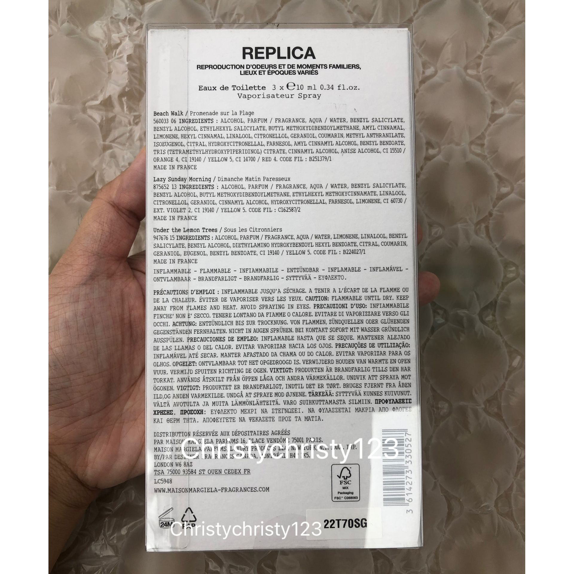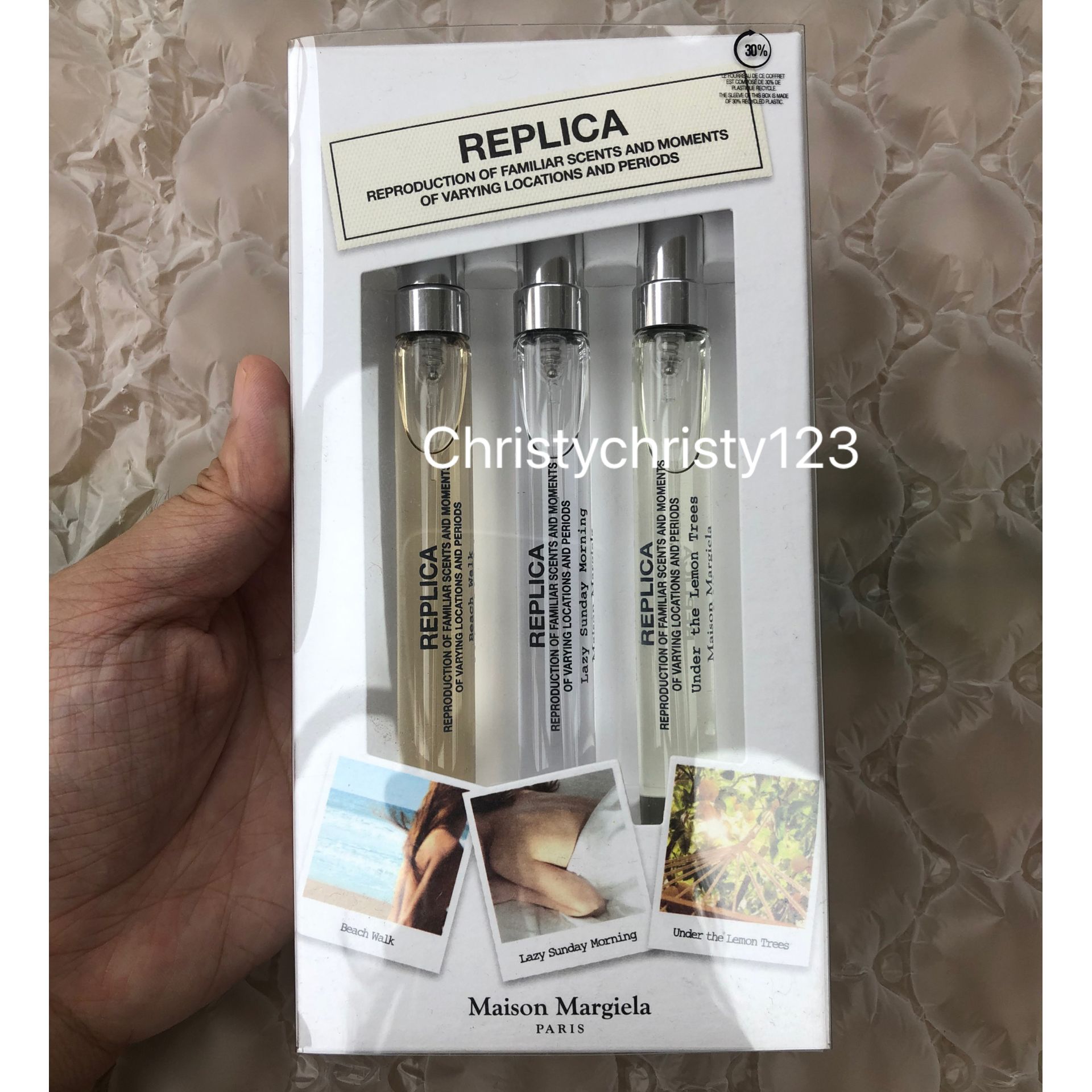 產地 : 法國 (Made in France) 品名 : Maison Margiela Replica Discovery 女士淡香水套裝:- 1. Lazy Sunday Morning 慵懶週末 10ml 2. Beach Walk 沙灘漫步 10ml 3. Under The Lemon Tree 檸檬樹下 10ml 容量 : 10 ml X 3 產品描述 : ** 通過 Maison Margiela 的三款暢銷香水:Lazy Sunday Morning, Beach Walk, Under The Lemon Tree,探索以過去珍貴時刻為靈感的香味 ** 沙灘漫步 Beach Walk是一款現代花香香水,喚起人們沿著海洋漫步的記憶,捕捉陽光燦爛的夏日氣息,散發著檸檬,椰奶和雪鬆的香氣。這是一款獨特的溫暖花香香水,喚起陽光和無憂無慮的印象 ** 慵懶週末 Lazy Sunday Morning是一款經典的花香香水,通過鮮梨,鳶尾和嫩白麝香的香調,回憶起柔軟,天鵝絨般的皮膚,記憶清新舒適的床單 ** 檸檬樹下 Under The Lemon Tree是一種柑橘香味,喚起人們在一個古老的別墅公園陽光明媚的逃亡之下在樹下打盹的記憶,在那裡,清新的柏樹和檸檬樹香氣飄浮在溫暖的微風中 🌟訂購產品前,歡迎 WhatsApp 6053 7862 或致電客服 2446 0981 查詢貨存,謝謝🙏 🌟