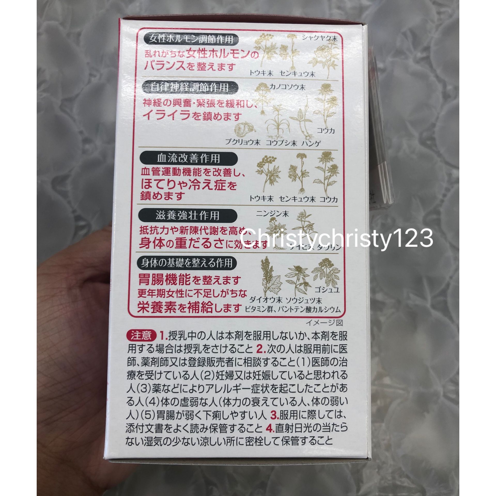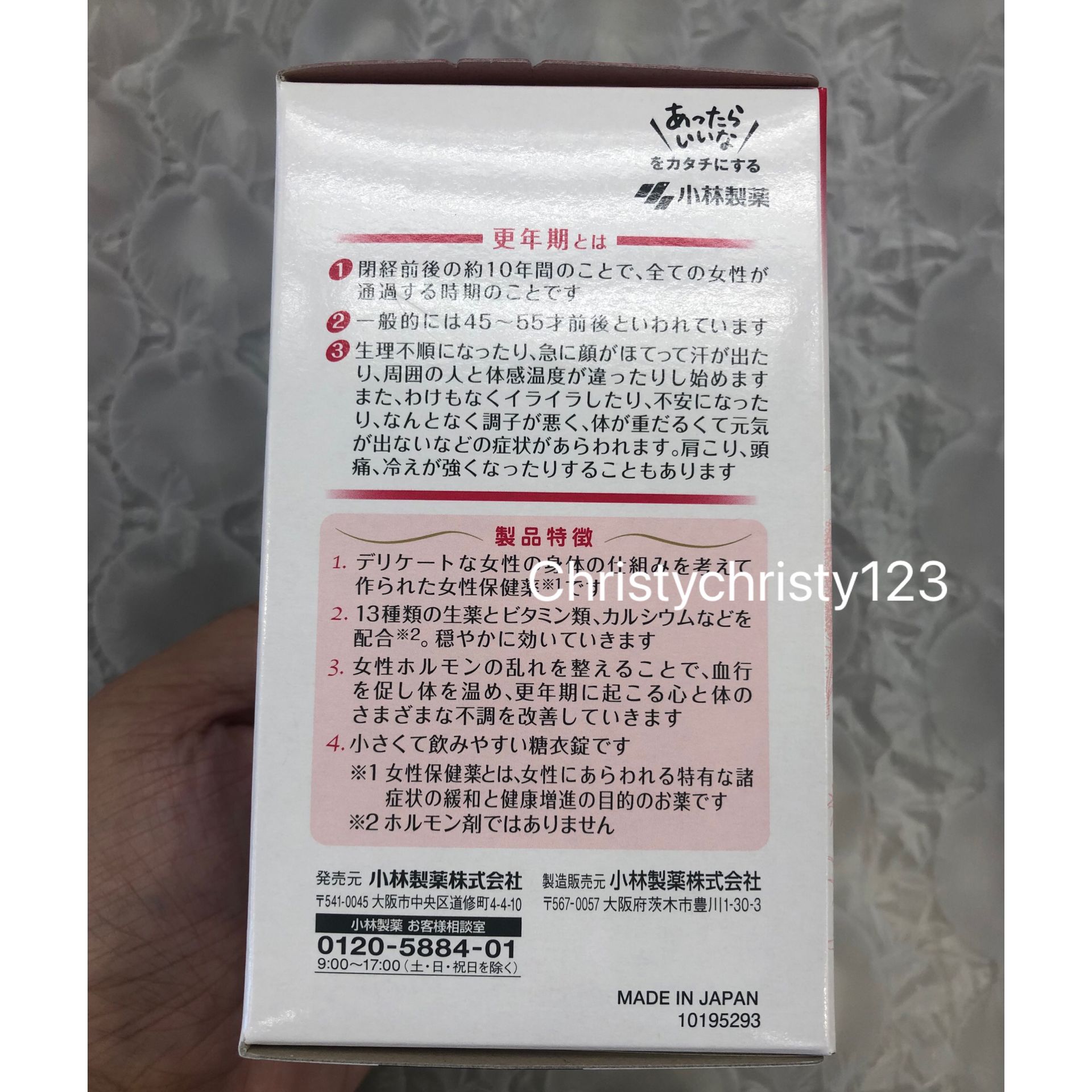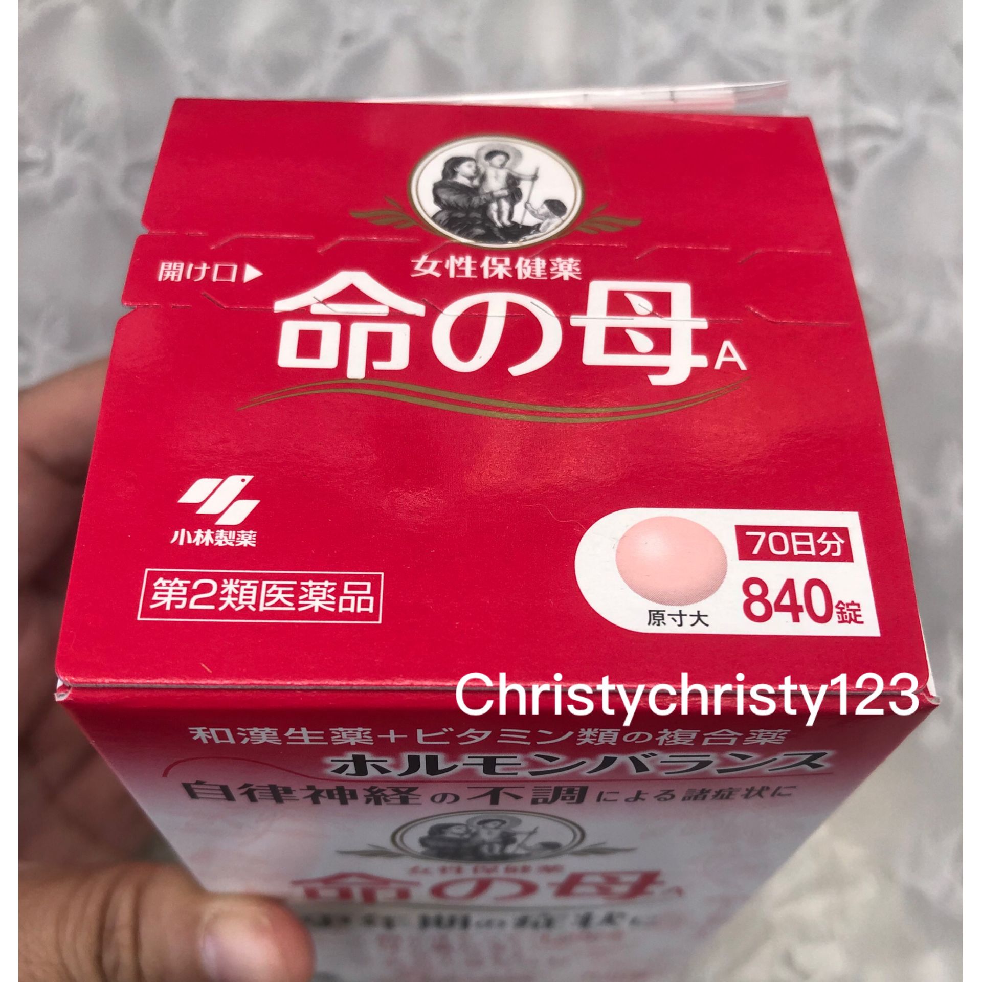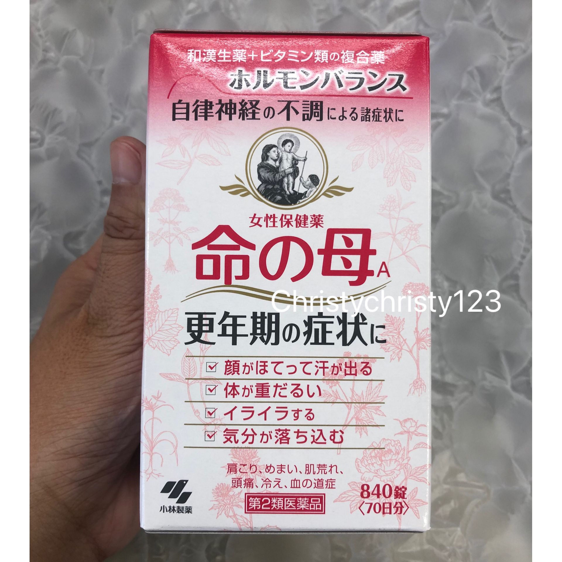 有效日期 : 2025年 03月 產地 : 日本 (Made in Japan) 品名 : 小林製藥 命之母 女性更年期保健丸 容量 : 840 粒 產品描述 : ** 讓女性荷爾蒙均衡的複合和漢保健藥,有效紓緩女性更年期的各種症狀 ** 更年期症狀、更年期神經症、因荷爾蒙失調引起的精神不振及煩躁、潮熱、生理不調、生理異常、生理痛、肩膀酸痛、冷汗、皮膚粗糙、頭暈、耳鳴、心悸、貧血、暗瘡粉刺、歇斯底里症狀(情緒激動)、白帶、分娩相關的症狀、腹痛或腰痛、血壓異常、頭痛、頭重 ** 針對女性氣虛血弱的身體機能,採用13種天然中草藥成分,配合維他命、鈣等的複合女性保健藥 ** 有效促進血液循環,令身體保溫,改善女性因荷爾蒙或自主神經系統的不協調而引起各種身體不適,幫助支持女性日常的生活 ** 藥丸細小以糖衣包住,容易吞服 使用方法: ** 一日三次,飯後服,每次4粒(15歲以下兒童請勿食用) 🌟訂購產品前,歡迎 WhatsApp 6053 7862 或致電客服 2446 0981 查詢貨存,謝謝🙏 🌟