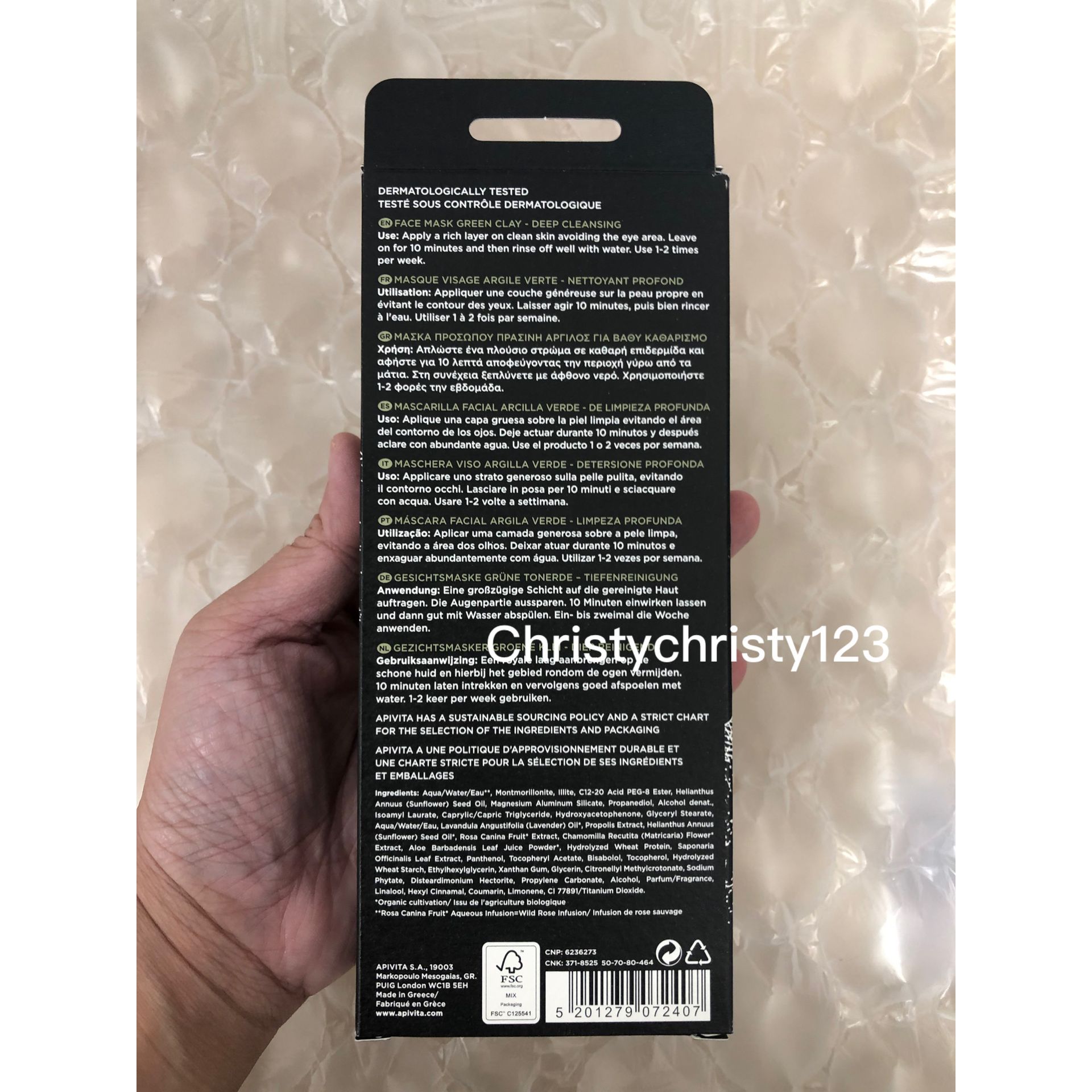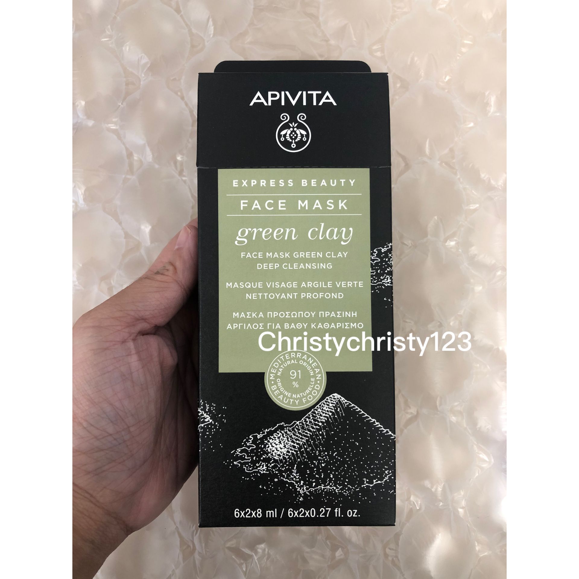 產地 : 希臘 (Made in Greece) 品名 : APIVITA 綠瓷土深層潔膚面膜 (APIVITA Face Mask -Green Clay) 容量 : 12包 x 8ml 產品描述 : ** 綠瓷土深層潔膚面膜採用一種具有極強吸附能力的粘土,提供排毒作用, 均勻膚色,締造健康光采 ** 有助深層潔淨,減少毛孔顯現, 去除多餘肌膚油脂, 清除黑頭 ** 適合油性、粉刺的肌膚 ** 綠瓷土和石鹼草有助深層清潔毛孔,去除多餘的油脂,消除黑頭 ** 蜂膠提供抗菌作用 ** 蘆薈、洋甘菊和小麥蛋白可使肌膚更加柔軟,更富光澤 ** 採用具抗氧化作用的野玫瑰調配為產品的基底 使用方法 : ** 取出面膜,敷在潔淨的面部肌膚上,避開眼部四周,待10分鐘後,以微濕的化妝棉抹掉,再以清水洗淨 ** 建議每星期使用1-2次,按需要而增加次數 🌟訂購產品前,歡迎 WhatsApp 6053 7862 或致電客服 2446 0981 查詢貨存,謝謝🙏 🌟
