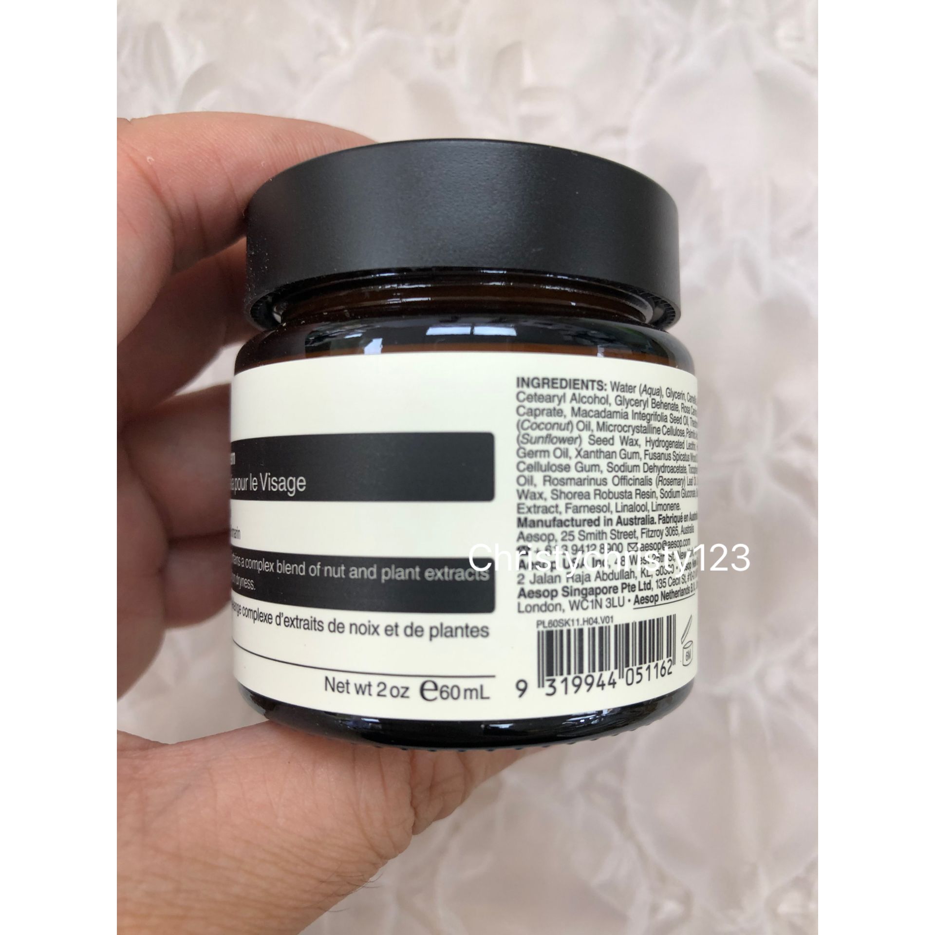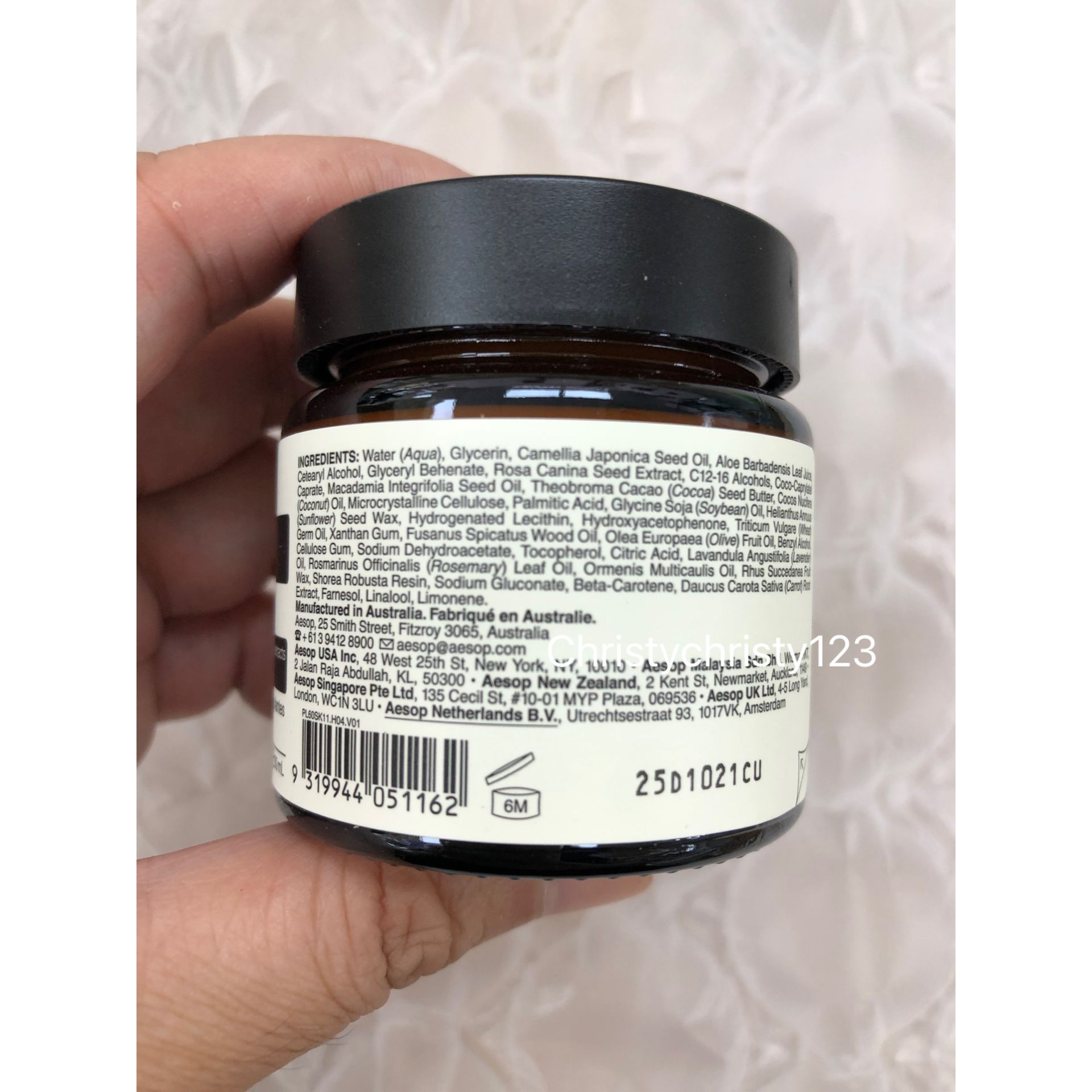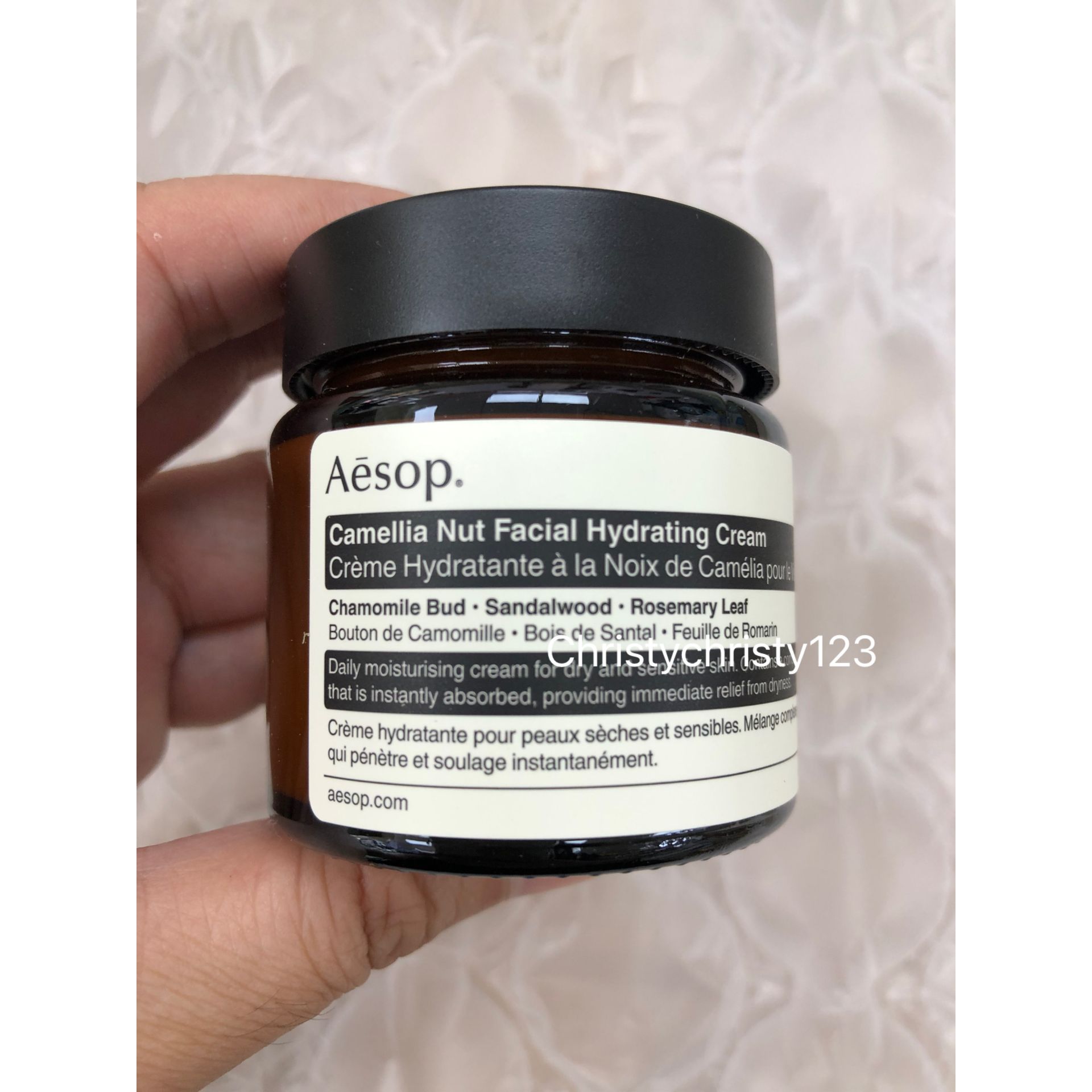 有效日期 : 2026年 10月 產地 : 澳洲 (Made in Australia) 品名 : Aesop 山茶核仁滋潤面霜 (Aesop Camellia Nut Facial Hydrating Cream) 容量 : 60 ml 產品描述 : ** 蘊含多重滋養配方,包括堅果及植物萃取物,有助增強抗氧化功效,而且極度滋潤保濕,質地輕盈 ** 輕柔潤乳霜, 適用於中性、乾燥及敏感性皮膚 ** 含有洋甘菊、檀香、迷迭香叶 ** 膚質感受到柔潤滋養,啞緻質地 ** 蘊含樹木幽香、堅果氣味、溫暖氣息 使用方法 : ** 用半茶匙分量 ** 早晚使用,按摩已潔淨及使用調理液的皮膚 🌟訂購產品前,歡迎 WhatsApp 6053 7862 或致電客服 2446 0981 查詢貨存,謝謝🙏 🌟