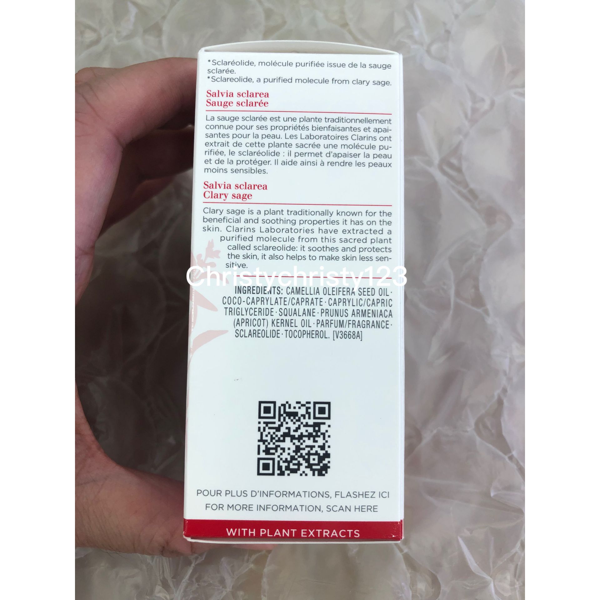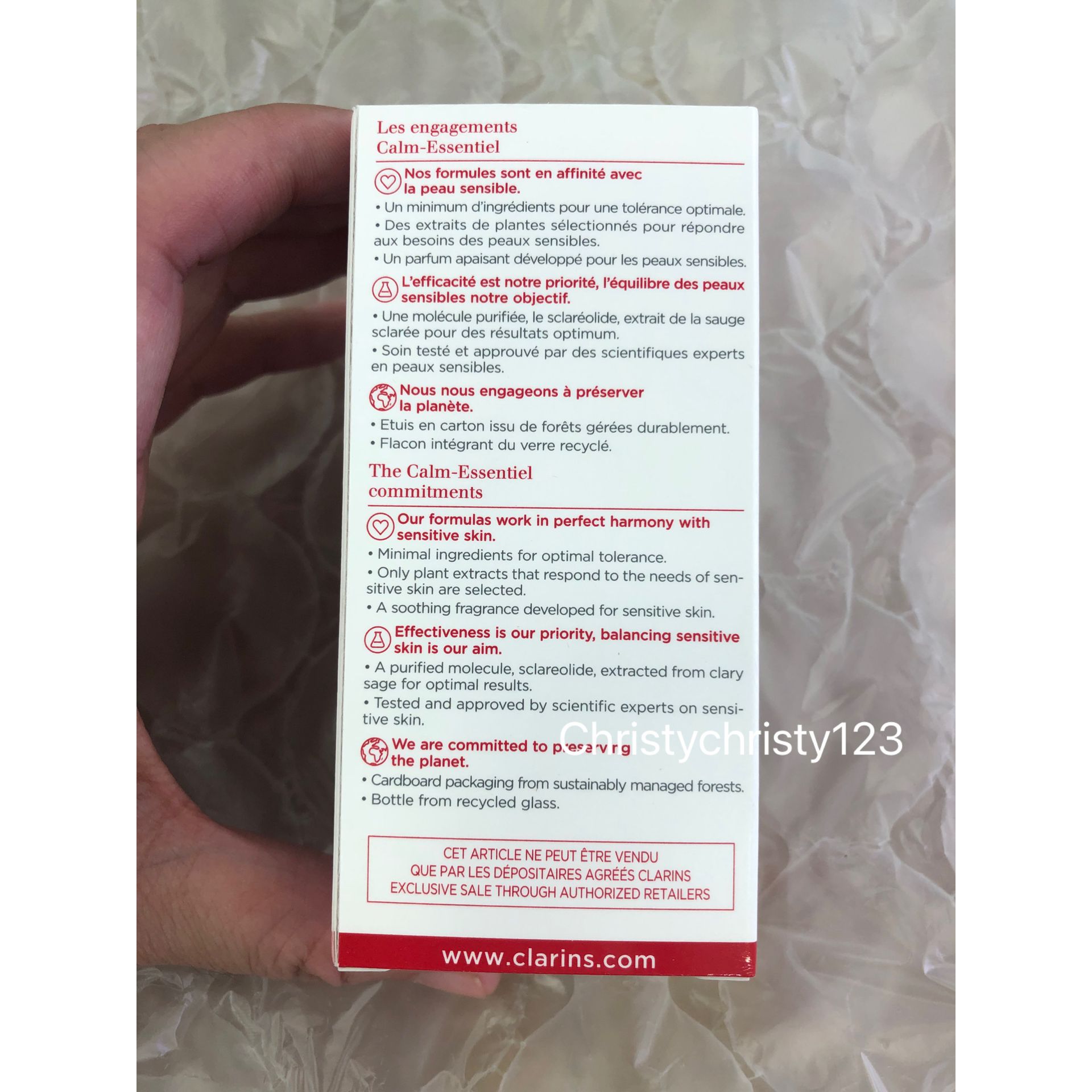 有效日期: 2023年 09月 產地 : 法國 (Made in France) 品名 : CLARINS 快樂鼠尾草舒敏調理油 (CLARINS Calm-Essentiel Restoring Treatment Oil) 容量 : 30 ml 產品描述 : ** 專為舒緩敏感和受損肌膚而設計,蘊含95%至98%的天然成分,溫和親膚 ** 瞬間舒緩敏感肌膚乾癢不適。深層滋養和保濕。有助於抵禦外界污染侵害 ** 尾草舒敏調理油能舒緩乾癢緊繃感覺,深層保濕、滋養和保護肌膚 ** 肌膚瞬間得到舒緩,柔軟彈嫩,每日使用有效提高肌膚耐受性。您可以按自己需求單獨使用調理油10-20天以調理肌膚,讓敏感肌煥然一新 ** 膚質: 混合性肌膚, 乾性肌膚, 一般肌膚, 油性肌膚 使用方法 : ** 日/夜間適用於臉部和頸部 ** 在手指之間回溫保養品,然後深呼吸,感受快樂鼠尾草萃取的寧神香氣。 屏住呼吸10秒 ** 在臉上輕輕按摩產品,可獲得即時舒緩效果 ** 以輕柔的排水按摩手法按摩雙頰、前額和頸部。 輕柔按壓臉部兩側和太陽穴 🌟訂購產品前,歡迎 WhatsApp 6053 7862 或致電客服 2446 0981 查詢貨存,謝謝🙏 🌟