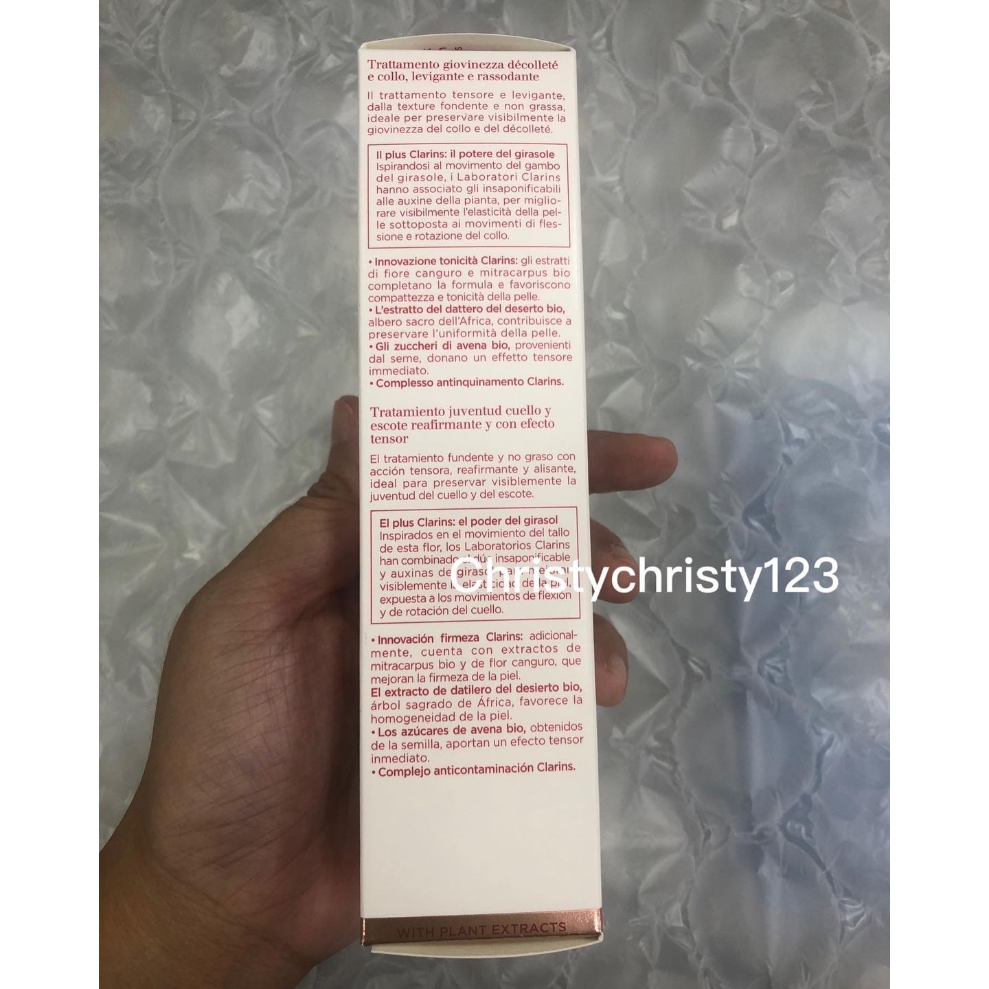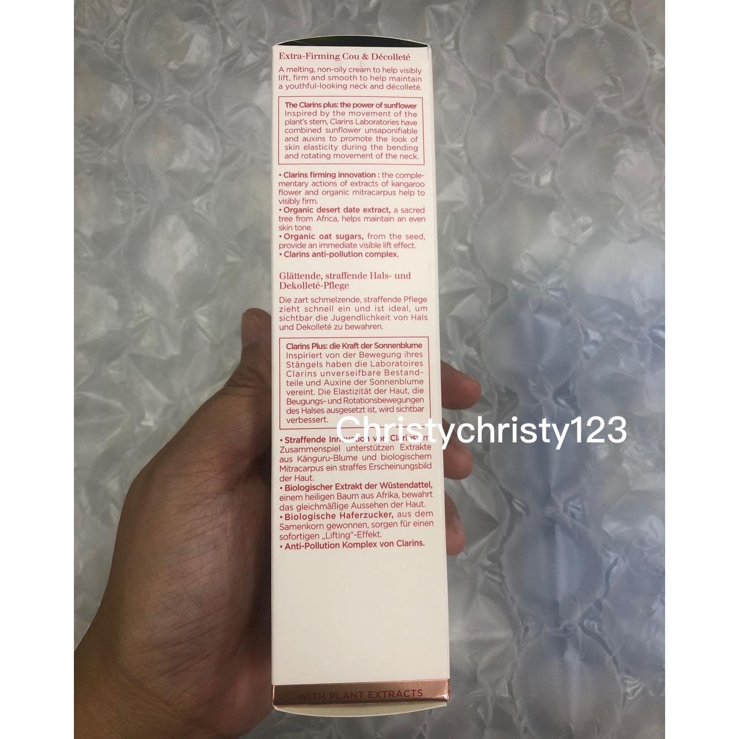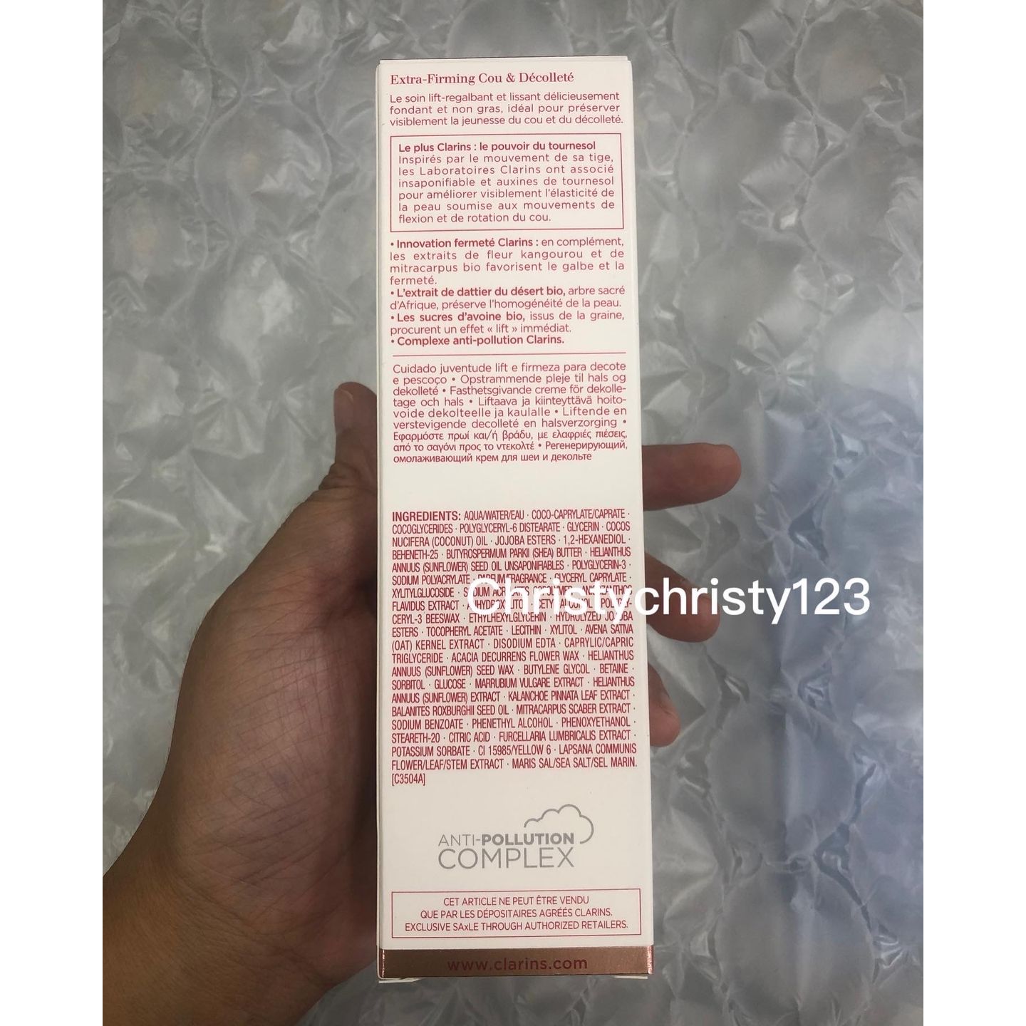 有效日期 : 2024年 10月 產地 : 法國 (Made in France) 品名 : Clarins 煥顏緊緻抗皺頸霜 (Clarins Extra-Firming Neck & Decollete Care) 容量 : 75 ml 產品描述 : **質地細滑不黏膩,可撫平頸部皺紋,並同時提拉塑形,以保持頸部和上胸的年輕 ** 蘊含向日葵萃取,可改善頸部和上胸腔的肌膚彈性,增強皮膚抵抗日常鬆弛的能力,緊緻肌膚,減淡頸紋,對抗鬆弛 ** 適合所有肌膚使用 使用方法 : ** 每日早晚, 以輕柔的按摩手法,從下巴按摩至肩頸部位 🌟訂購產品前,歡迎 WhatsApp 6053 7862 或致電客服 2446 0981 查詢貨存,謝謝🙏 🌟