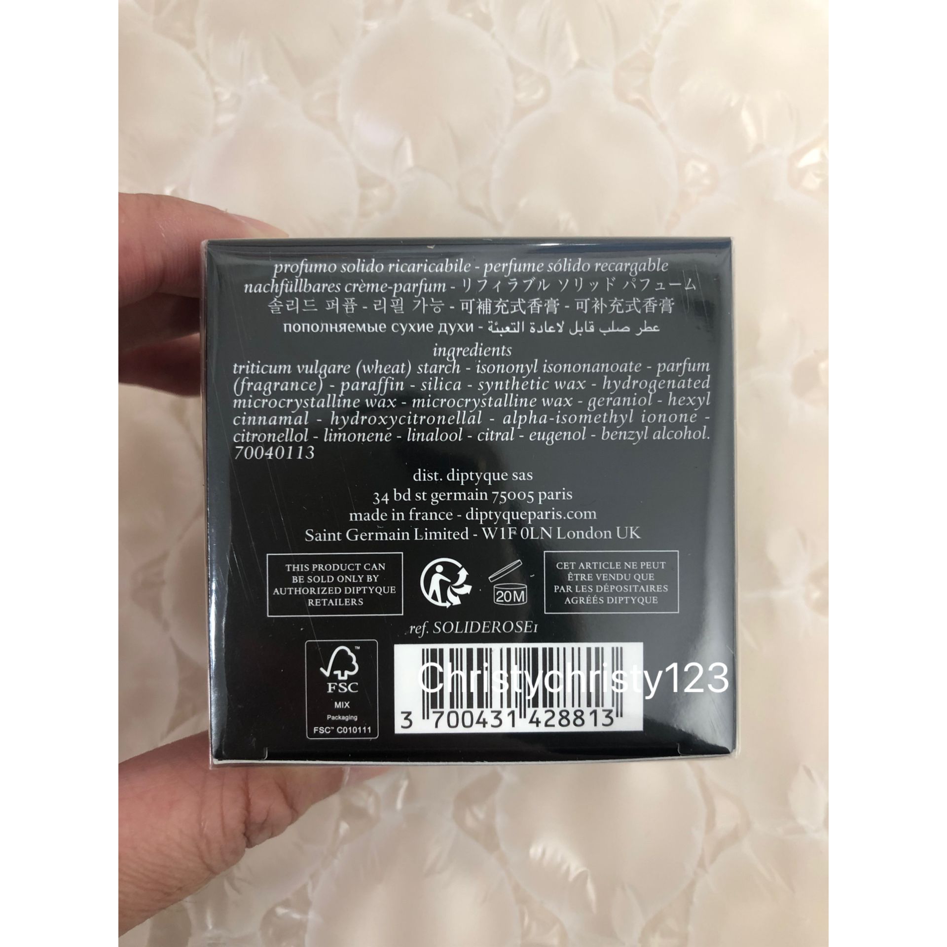 產地 : 法國 (Made in France) 品名 : Diptyque 可替芯香水膏 -玫瑰 (Diptyque Roses Refillable Solid Perfume) 容量 : 3 g 產品描述 : ** 手掌大小的 diptyque 固體香氛延續了品牌經典的橢圓型包裝,且更便於隨身攜帶,並特別推出環保香膏補充裝,用完後留下外盒可無限補充香膏 ** 為固體香水型態的 Solid Perfume 本身不含酒精,可暈染於任何想要保有迷人香氣的身體部位 ** 可以自由混搭不同香氛、創造芳香層次,讓你一整天都能沈浸在溫和、優雅而恬淡的香氛中 ** 固體香水沒有酒精成分,適合因為對酒精有過敏而不能塗香水的體質 ** 此款精美的香膏可搭配補充香膏重複填充使用 🌟訂購產品前,歡迎 WhatsApp 6053 7862 或致電客服 2446 0981 查詢貨存,謝謝🙏 🌟