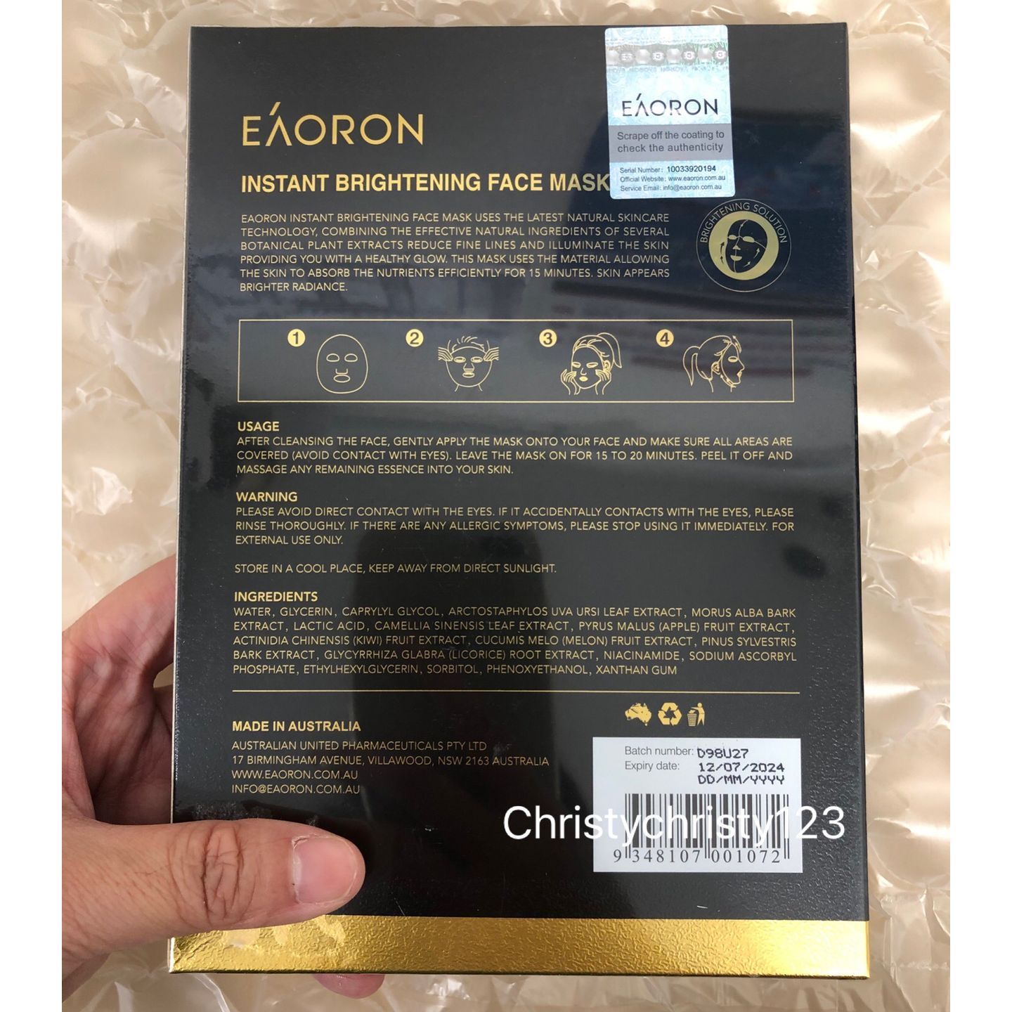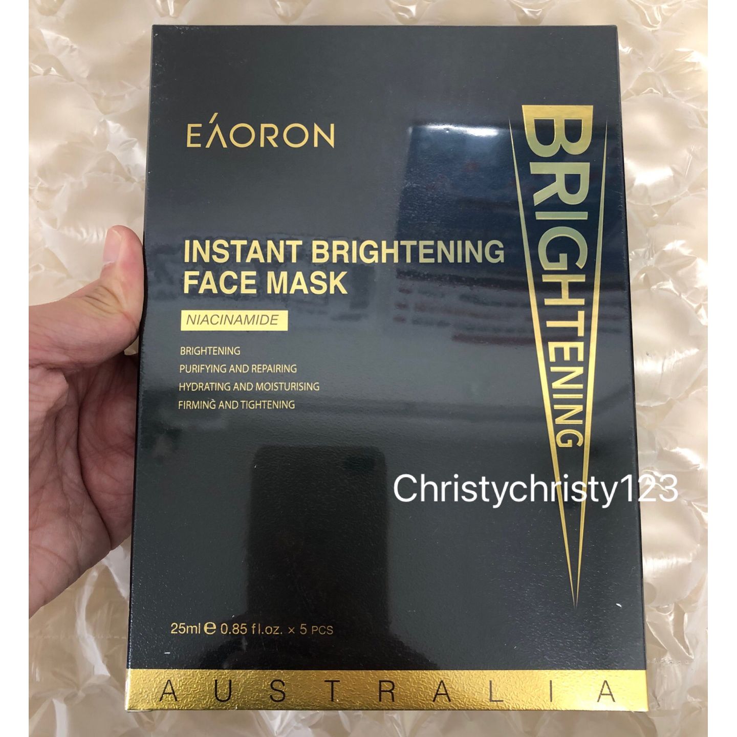 有效日期 : 2026年 07月 產地 : 澳洲 (Made in Australia) 品名 : EAORON 光速美白黑面膜 (EAORON Instant Brightening Face Mask) 容量 : 5 片 產品描述 : ** 以閃電嶺的黑澳寶打造膜布,以微循環及蜂巢模式,導入養分及提亮,令肌膚由內至外晶瑩剔透,綻放嫩滑光感 ** 以珍稀黑澳寶經十道工序研發而成的「AHI黑澳寶」膜布,當中有微循環及蜂巢模式,以遠紅外線及微電流,提升肌膚表面溫度,加快吸收,有助導入濃郁精萃及煥亮美肌;繁多微孔結構更可吸附污垢 ** 蘊含symWhite®377,抗氧化+提亮;酵母萃取物調整肌膚狀態,煙醯胺改善肌肤黯淡無光,讓膚色更均勻透亮 ** 澳洲植萃加乘修護力,包括杜氐鹽生海藻、桑白皮提取物及熊果素有助勻淨膚色;中華獼猴桃果提取物有助抗初老,肌膚更顯年輕有活力 使用方法 : ** 潔膚及爽膚後,將面膜展開敷於臉上十五分鐘後取下,輕輕按摩剩餘精華至吸收 🌟訂購產品前,歡迎 WhatsApp 6053 7862 或致電客服 2446 0981 查詢貨存,謝謝🙏 🌟