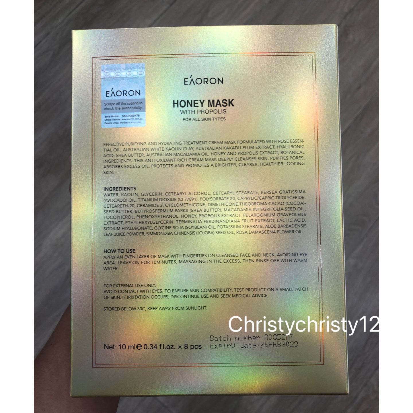 有效日期 : 2026 年 02月 產地 : 澳洲 (Made in Australia) 品名 : EAORON 蜂蜜蜂膠修復面膜 (EAORON Honey Mask) 容量 : 8 片 產品描述 : ** 從新西蘭麥盧卡蜂蜜中提煉出蜂蜜、蜂膠及蜂毒成份,可豐富膠原蛋白,滋潤補濕,緊實瑩潤美肌,保持肌膚活力及持久潤澤 ** 10分鐘密集修護,3倍角質潤澤力,可深層清潔皮膚,淨化毛孔,吸收多餘油脂;同時由表入心補充水份,改善乾燥,增益肌膚壁壘及抗禦力,均衡水油狀態,有助淡化細紋及抗初老化 ** 蘊含玫瑰精油、澳洲白高嶺土、澳洲卡卡杜李子提取物、透明質酸、乳木果油、澳洲夏威夷果油、神經酰胺、可可油,豐富植物成分有效淨化和保濕,改善氧化,提升膚色晶瑩及明亮度 ** 獨立小果凍包裝,一次一粒,即開即用,方便衛生,附贈硅膠面膜刷,柔軟親膚,護膚清潔一步到位 使用方法 : ** 潔膚後,打開一杯,用硅膠刷將面膜泥塗勻塗抹於臉及頸上,待十分鐘後,輕輕按摩及洗走 🌟訂購產品前,歡迎 WhatsApp 6053 7862 或致電客服 2446 0981 查詢貨存,謝謝🙏 🌟
