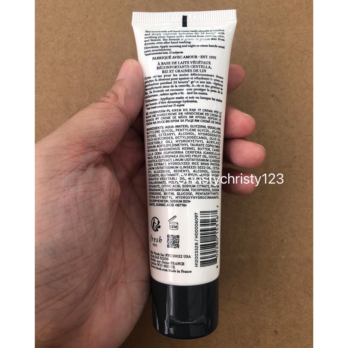 有效日期: 2025年 01月 產地 : 法國 (Made in France) 品名 : Fresh 乳潤柔膚護手霜 (Fresh Milk Hand Cream) 容量 : 50 ml 產品描述 : ** 這款深層保濕護手霜蘊含植物奶有助舒緩及保護雙手免受乾燥 ** 蘊含三款植物奶 — 積雪草、白米和亞麻籽,有助舒緩及保護雙手免受乾燥 ** 綿密舒適質地能軟化雙手肌膚與角質層,即使在洗手後也能保護皮膚滋潤不乾燥 ** 透明質酸 : 能吸收和保持水分,達到豐盈的效果 ** 積雪草、白米和亞麻籽中萃取的植物奶,有助於舒緩、令肌膚感到舒適及強化肌膚屏障功能。使用特定的工序將植物混和特級初榨橄欖油,創造出三款獨特、溫和、如牛奶般柔滑的潤膚乳 ** 維他命 E : 幫助保護、舒緩及軟化肌膚 ** 生物素 : 有助於撫平及讓肌膚變得柔軟,散發健康氣息及光澤。也被稱為維生素 B7,具有出色的美容作用,能維持指甲的強健 使用方法 : ** 可早晚使用或當手部感到乾燥時使用 🌟訂購產品前,歡迎 WhatsApp 6053 7862 或致電客服 2446 0981 查詢貨存,謝謝🙏 🌟
