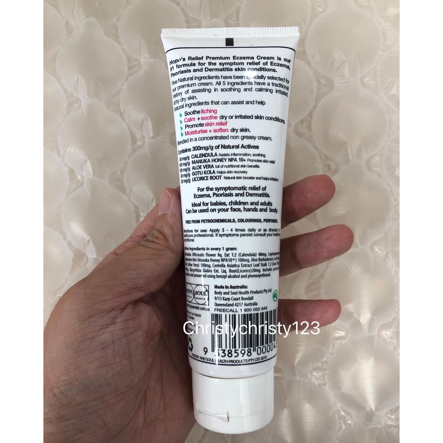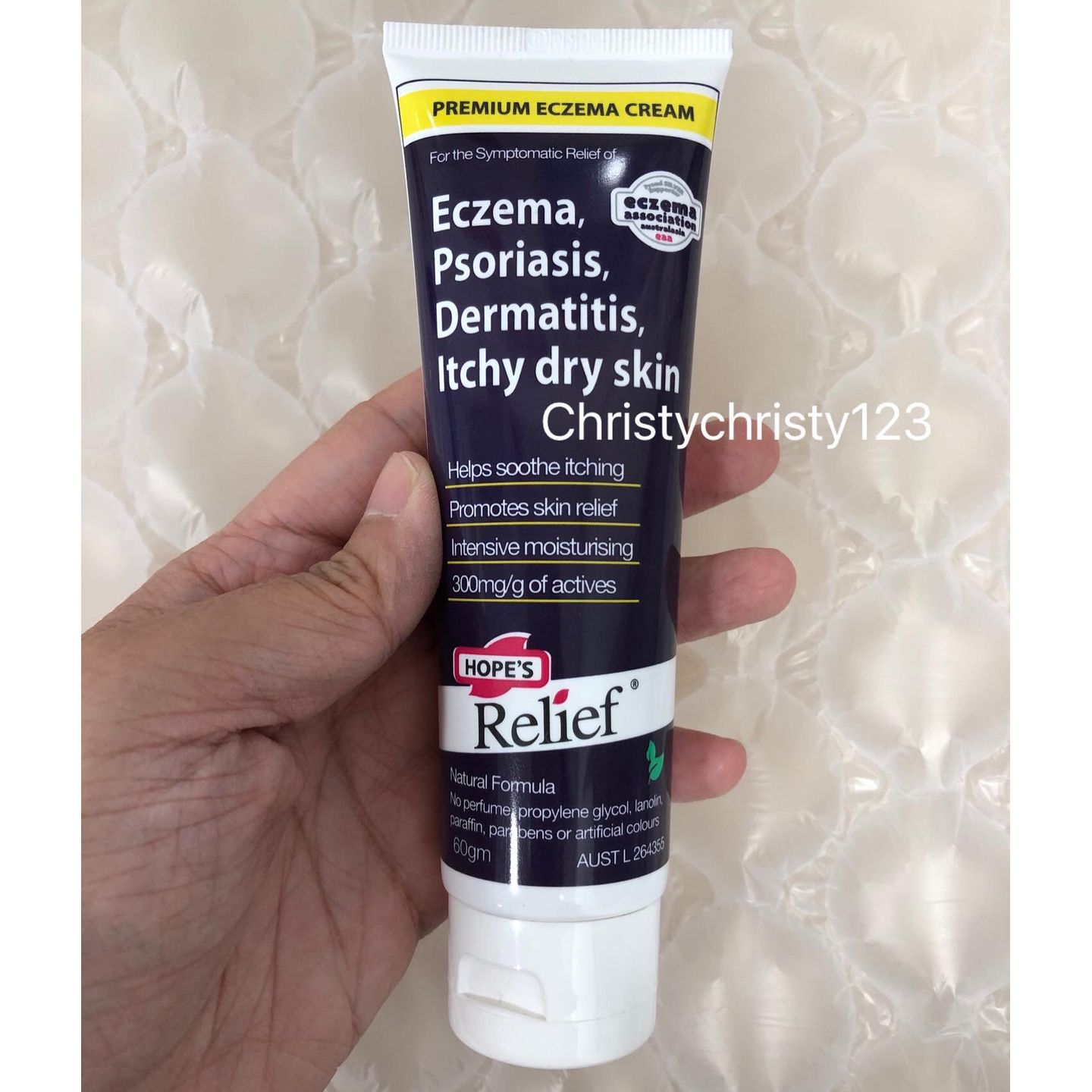 有效日期 : 2024年 10月 產地 : 澳洲 (Made in Australia) 品名 : 澳洲 Hope’s Relief 天然濕疹膏 容量 : 60 g 產品描述 : ** 功效: 針對濕疹,牛皮癬,皮炎的症狀,有效緩解痕癢, 抗發炎,促進癒合,保濕,防過敏 ** 含有300mg / g的活性天然成分,可以幫助舒緩瘙癢 ** 含麥盧卡蜂蜜UMF 10 +具有高度抗菌活性,能效消除金黃色葡萄球菌, 有效平靜和舒緩乾燥或刺激的皮膚 ** 抗發炎,促進癒合; 保濕,防過敏 ** 全天然,不含香料, 不含任何化學物質 ** •適用於嬰兒,兒童和成人 ** 適用於身體各部份 使用方法 : ** 於肌膚不適位置,每天塗抹3-4次,取適量即可 ** 如果症狀持續,請諮詢醫務人員 🌟訂購產品前,歡迎 WhatsApp 6053 7862 或致電客服 2446 0981 查詢貨存,謝謝🙏 🌟