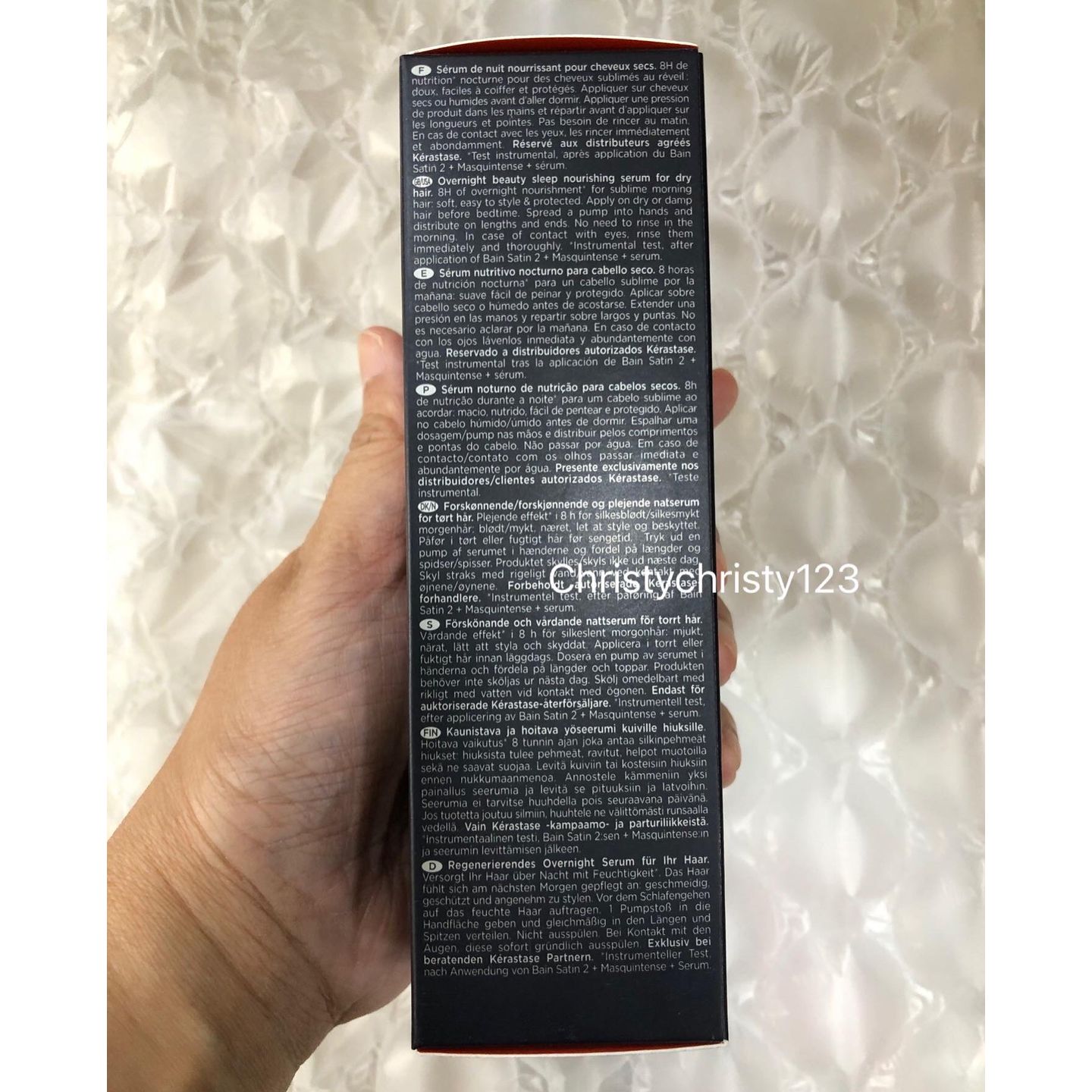 有效日期 : 2024 年 10月 品名 : KERASTASE 夜間奇蹟修護精華 (KERASTASE 8H Magic Night Serum) 容量 : 90 ml 產品描述 : ** 卡詩首款睡眠專用秀髮滋養精華,蘊含珍貴潤養配方:鳶尾花萃取物及5種混合維他命,夜間8H高效修護乾燥脆弱髮絲,一覺醒來,擁有順滑不打結的光澤秀髮 ** 適合乾性至極乾旱髮質 乳液狀凝膠質地能有助髮絲吸收,使用精華後 8 小時內會深入髮絲纖維,令頭髮變得更輕盈、柔軟 ** 可有效減少纖細頭髮的打結情況,粗硬頭髮亦變得更易打理 使用方法 : ** 洗髮後以毛巾印乾多餘水份,然後使用2-4泵(視乎不同頭髮的長度及厚度),均勻塗抹於髮絲中後段。亦可於乾髮上使用 🌟訂購產品前,歡迎 WhatsApp 6053 7862 或致電客服 2446 0981 查詢貨存,謝謝🙏 🌟
