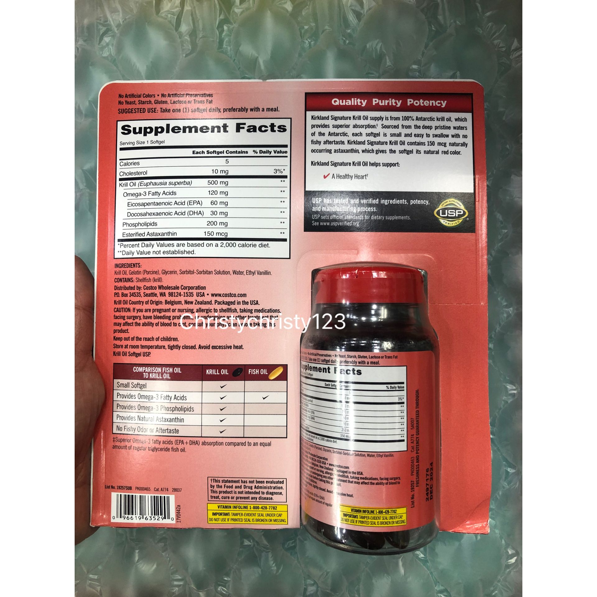 有效日期:2025年 07月 產地 : 美國 (Made in U.S.A.) 品名 : Kirkland 南極磷蝦油 500MG (Kirkland Krill Oil) 容量 : 160 粒 產品描述 : ** 100%純南極磷蝦油,源自南極深海的微型甲殼動物 ** 南極磷蝦油富含磷脂、DHA/EPA、蝦青素等成份,是有益不飽和脂肪酸的極佳來源。而且更容易被身體吸收,功效比頂級魚油更顯著 ** 磷蝦油的磷脂主要作用是血管清道夫、維護心臟健康,提供身體抗氧化、抗炎功效,有助改善關節炎症痛楚等等 ** 促進腦部功能發展, 減低炎症、潤滑關節, 舒緩經前症候群 使用方法 : ** 每日 1粒,隨餐服用 🌟訂購產品前,歡迎 WhatsApp 6053 7862 或致電客服 2446 0981 查詢貨存,謝謝🙏 🌟