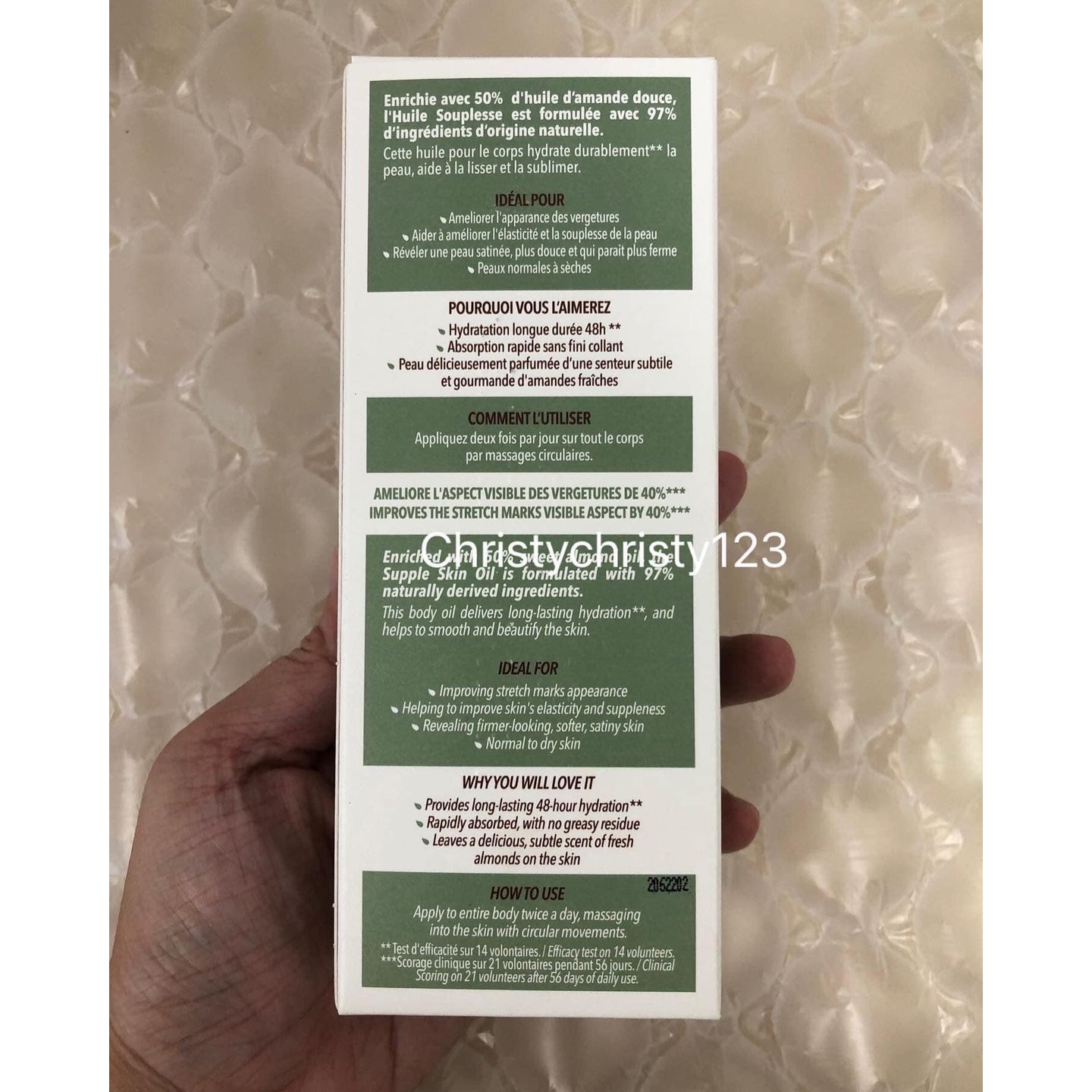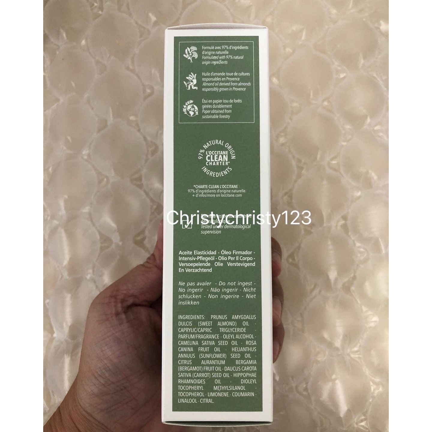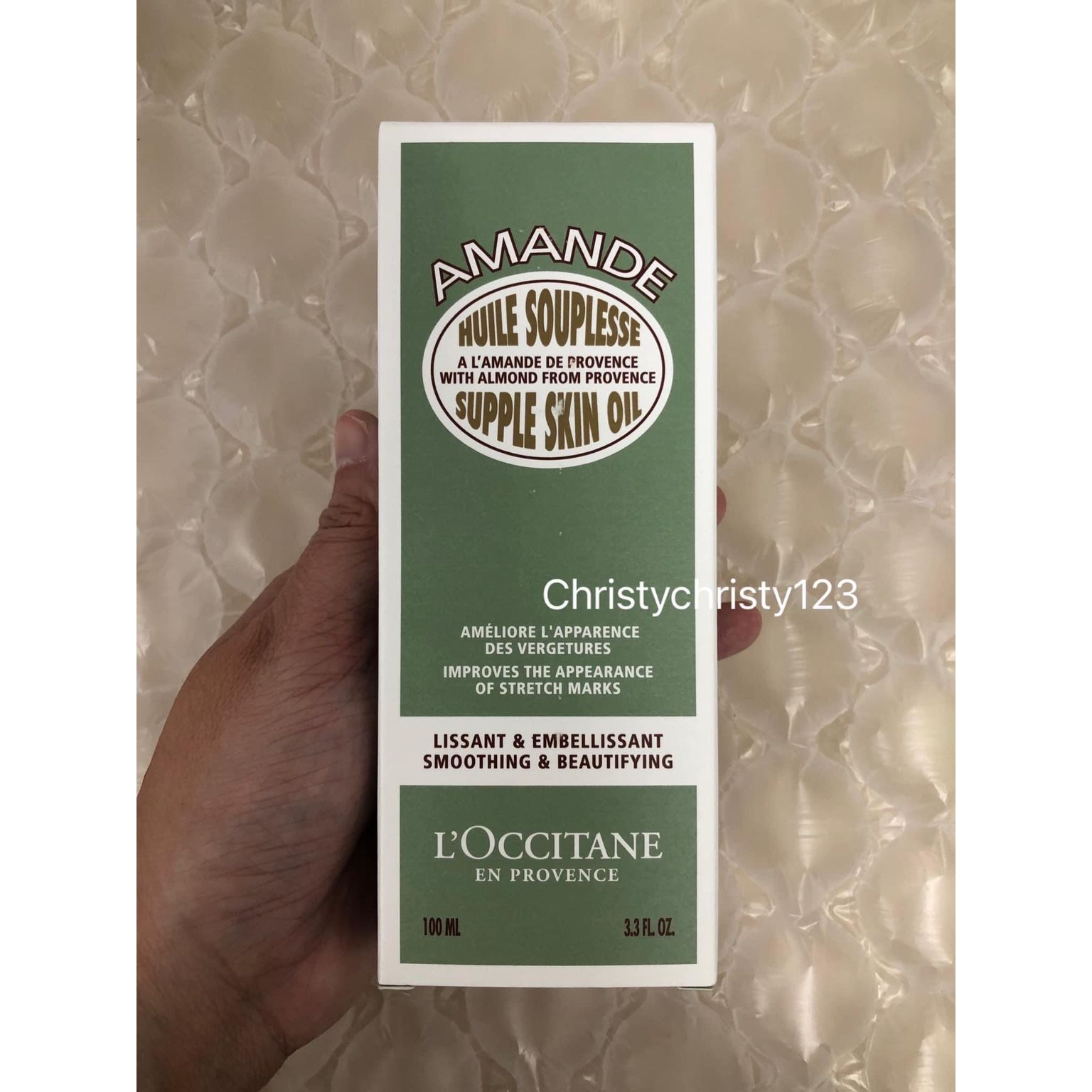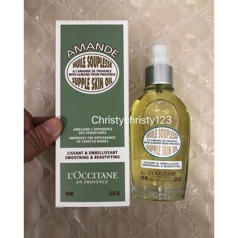 有效日期 : 2024 年 08月 產地 : 法國 (Made in France) 品名 : L'OCCITANE 杏仁緊實美膚油 (L'OCCITANE Almond Supple Skin Oil) 容量 : 100 ml 產品描述 : ** 預防伸展紋的形成,有效緊緻肌膚,保濕效果顯著,深層滋養,令肌膚重拾柔嫩結實 ** 清新自然的香味,含有矽質,能夠促進膠原纖維合成,預防伸展紋的形成,有效緊緻肌膚,令肌膚變得更光滑 ** 加上杏仁油及亞麻薺籽油的配方,富含Omega 3 及6,保濕效果顯著,深層滋養,令肌膚重拾柔嫩結實 ** 富含3種精油成分:薄荷,蠟菊和玫瑰草。幫助修復和保護肌膚,同時緊致肌膚。有效預防妊娠紋 ** 適用肌膚:所有膚質 🌟訂購產品前,歡迎 WhatsApp 6053 7862 或致電客服 2446 0981 查詢貨存,謝謝🙏 🌟