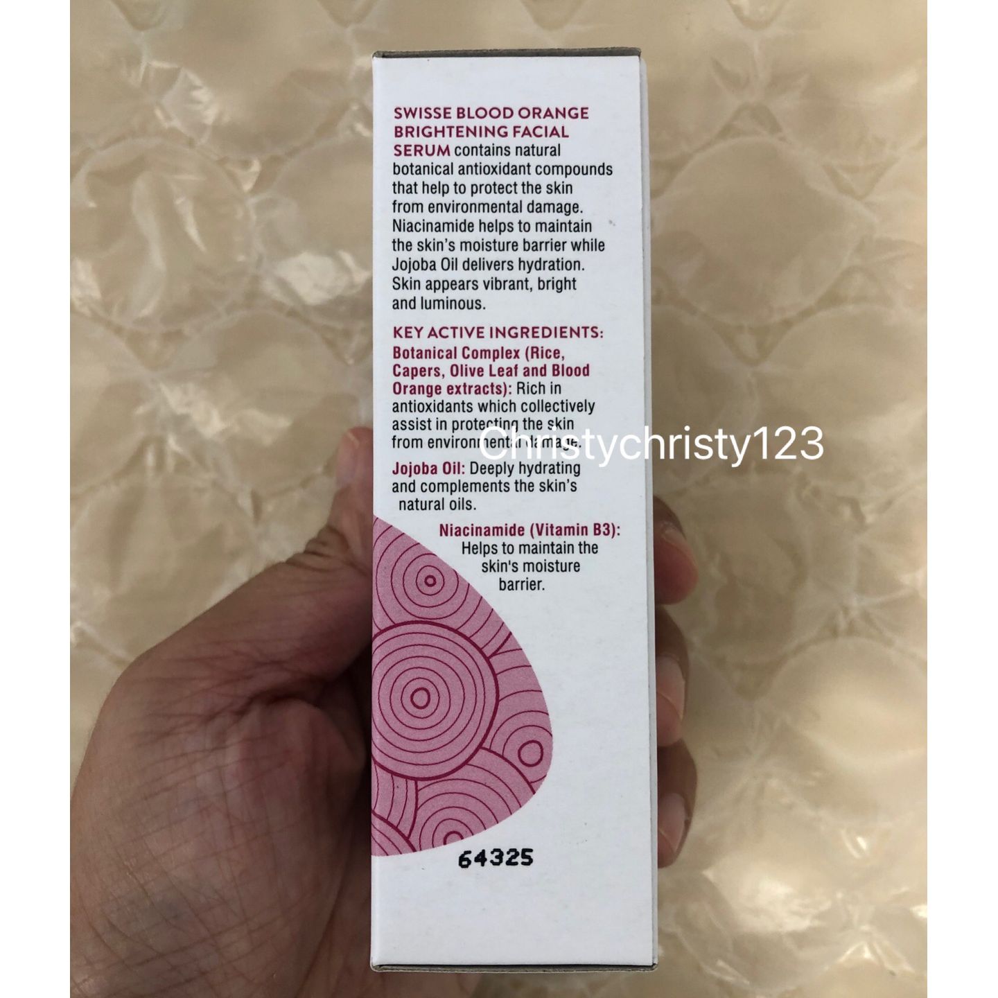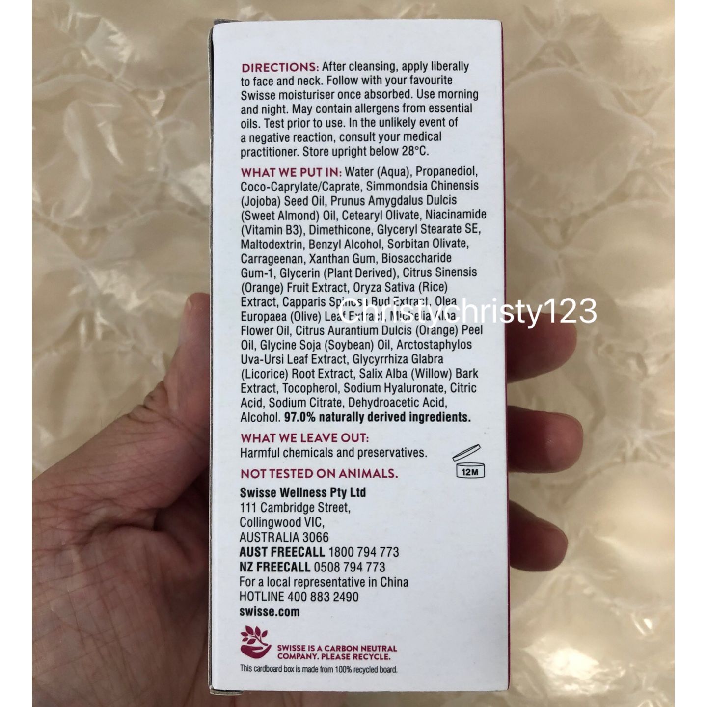 產地 : 澳洲 (Made in Australia) 品名 : Swisse 血橙亮白精華 (Swisse Blood Orange Brightening Facial Serum) 容量 : 30 ml 產品描述 : ** Swisse 血橙亮膚面部精華液可以提亮肌膚使肌膚充滿光澤並有助於保護肌膚,防止老化 ** 適用於受膚色不均和色素沉澱困擾的人群 ** 維生素B3: 有助於提亮並應對肌膚皺紋 ** 甘草根提取物:肌膚提亮劑,有助於平衡肌膚色素沉澱過度 ** 荷荷巴油:補充肌膚油脂 ** 產品不含:有害化學成分、防腐劑和動物成分。產品不使用動物測試 使用方法 : ** 潔面後將產品塗於面部和頸部, 早晚使用 🌟訂購產品前,歡迎 WhatsApp 6053 7862 或致電客服 2446 0981 查詢貨存,謝謝🙏 🌟